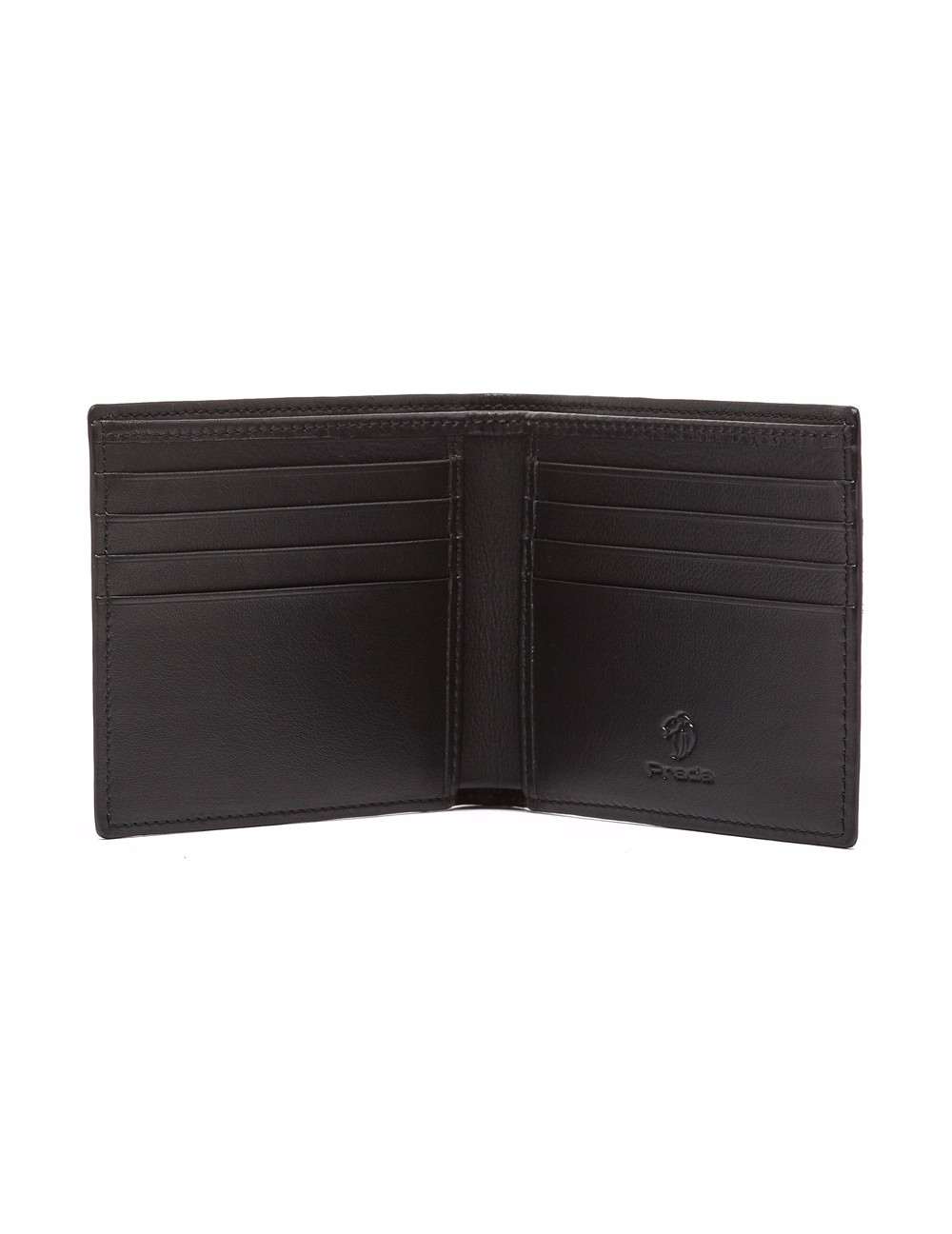 Cartera horizontal mediana delgada en acabado napa. Detalle de grabado "león Prada" a fuego en frontal. Interiores en el mismo acabado, cuenta con tarjeterosy talcon, grabado "Prada" a fuego.