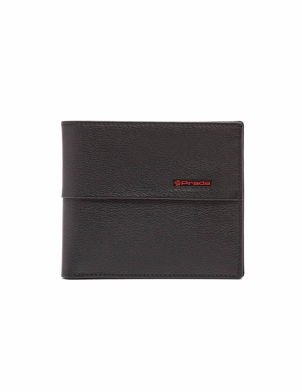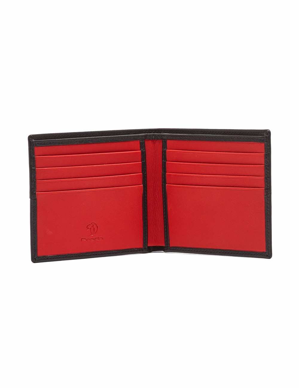 Cartera horizontal mediana delgada en acabado napa. Detalle de franja al color y bajo relieve "Prada" en frontal. Interiores en el mismo acabado y vivos en contraste, cuenta con tarjeteros y grabado "Prada" a fuego.
