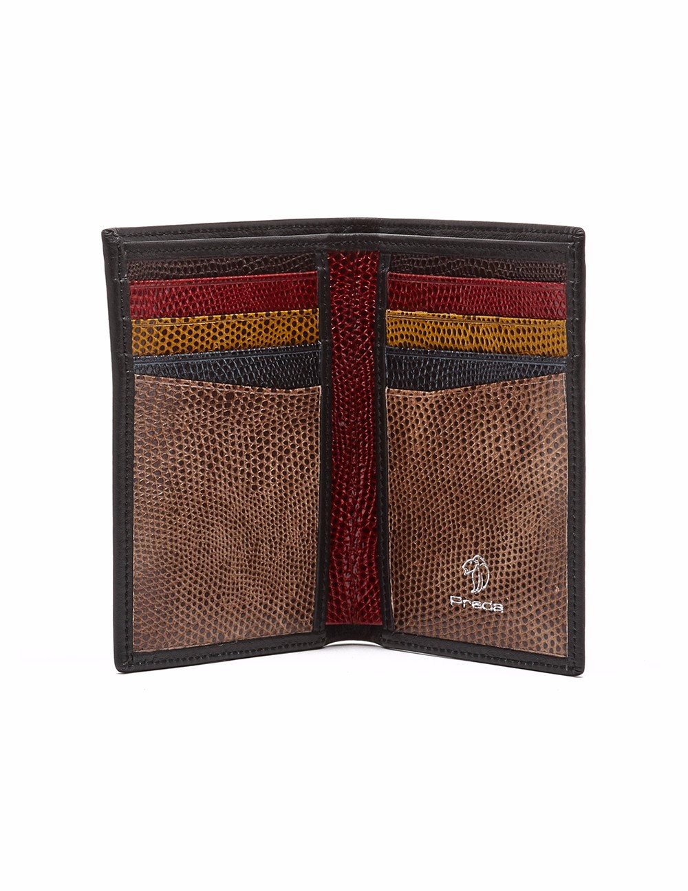 Cartera vertical mediana delgada en acabado napa. Detalle de grabado "Prada" a fuego en frontal. Interiores en grabados multicolor en contraste, cuenta con tarjeteros y timbrado "león Prada" en plata.