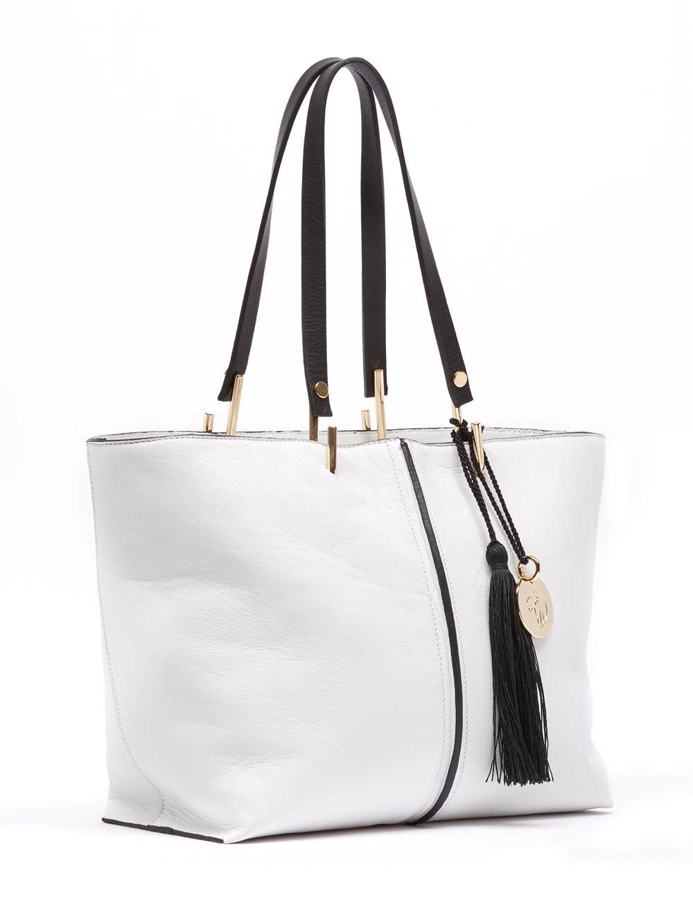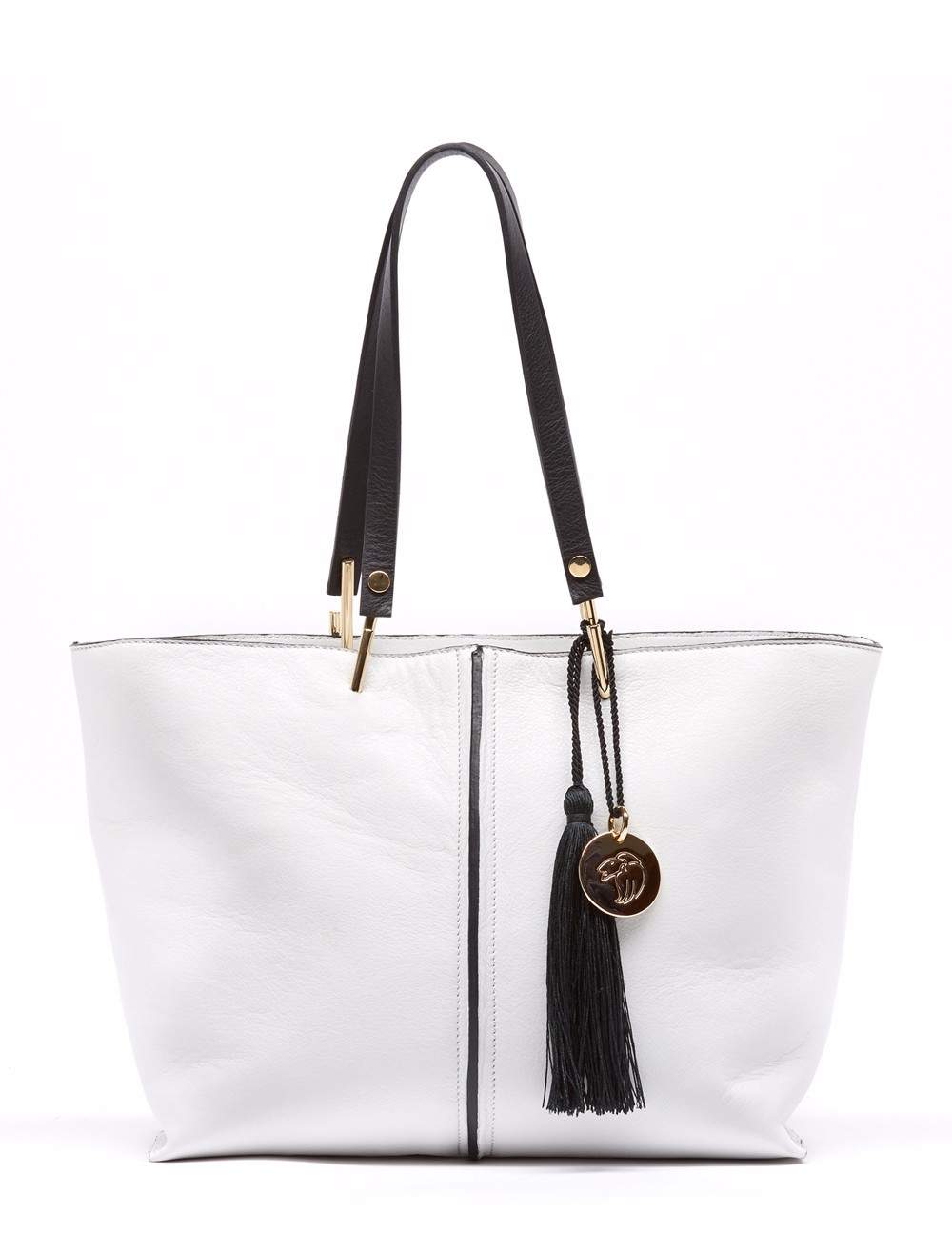 Bolso tote en acabado piel. Detalle de unión central con lujado en contraste y pespuntes al color del bolso, asas con sujeción de bastoncillos metálicos y pompón. Bolsos utilitarios internos. Asa de hombro en contraste. Herrajes y fornituras en dorado, así como medallón león Prada. Medidas: 41x21x13 cm