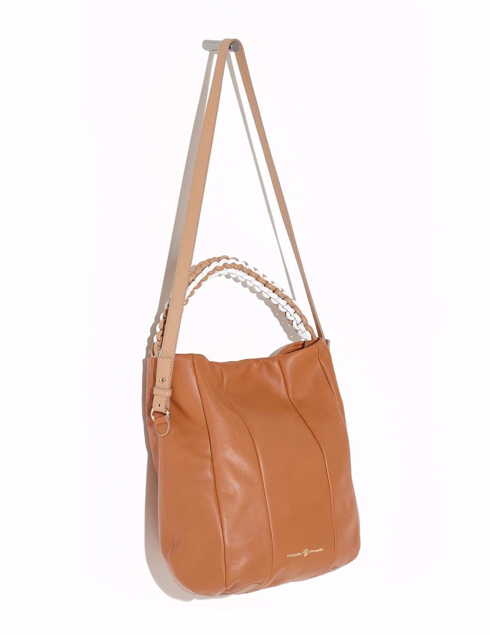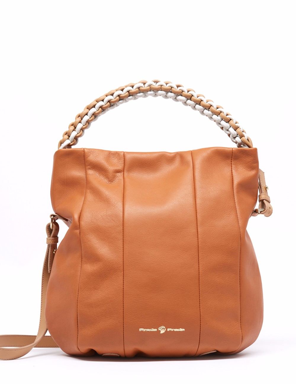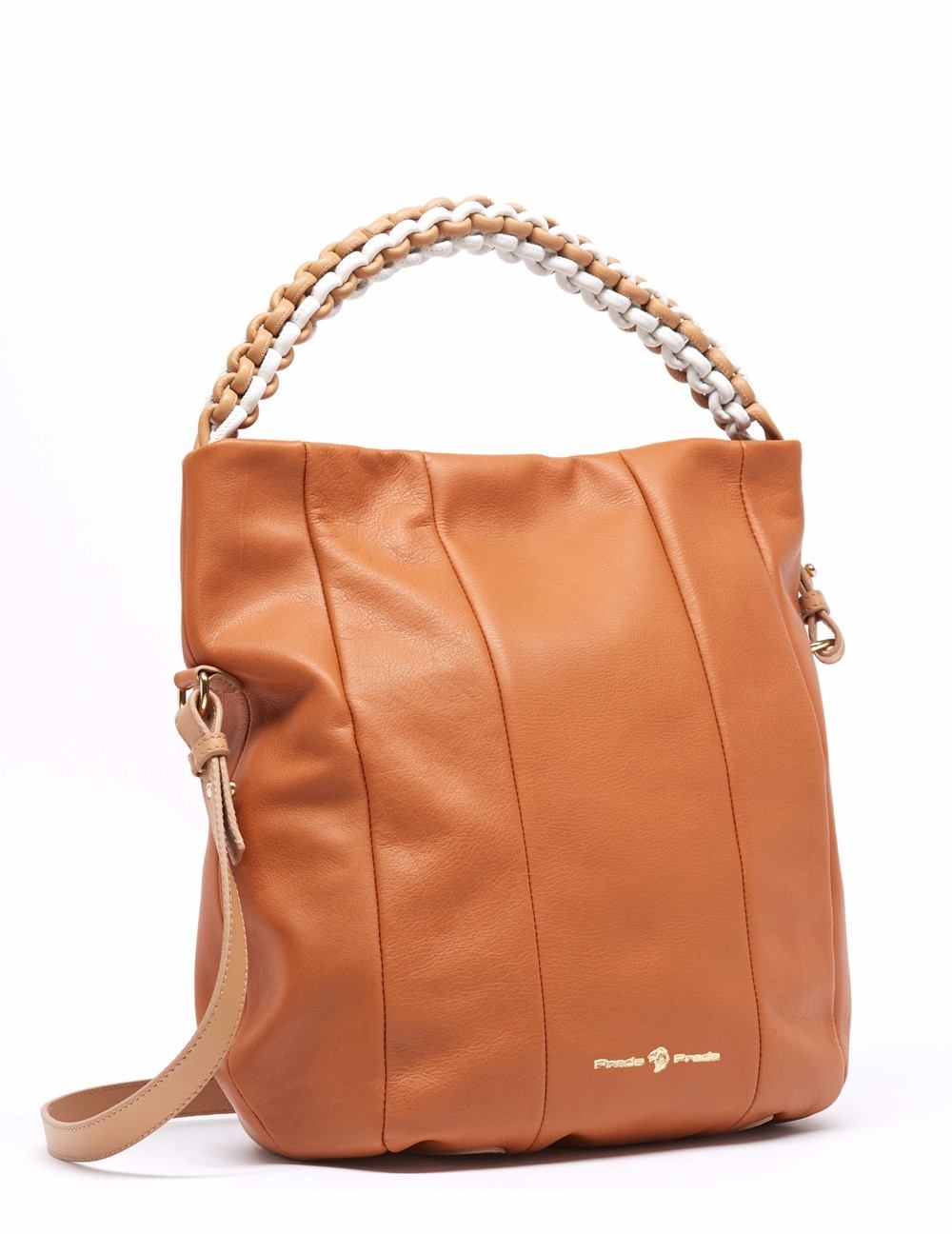 Bolso hobo en acabado piel napa. Bolsos utilitarios internos y forro personalizado león Prada. Asa de hombro trenzada en varios colores y asa bandolera al color del bolso. Herrajes y fornituras en plateado grabado y timbrado de león Prada. Medidas: 36x36.5x11 cm