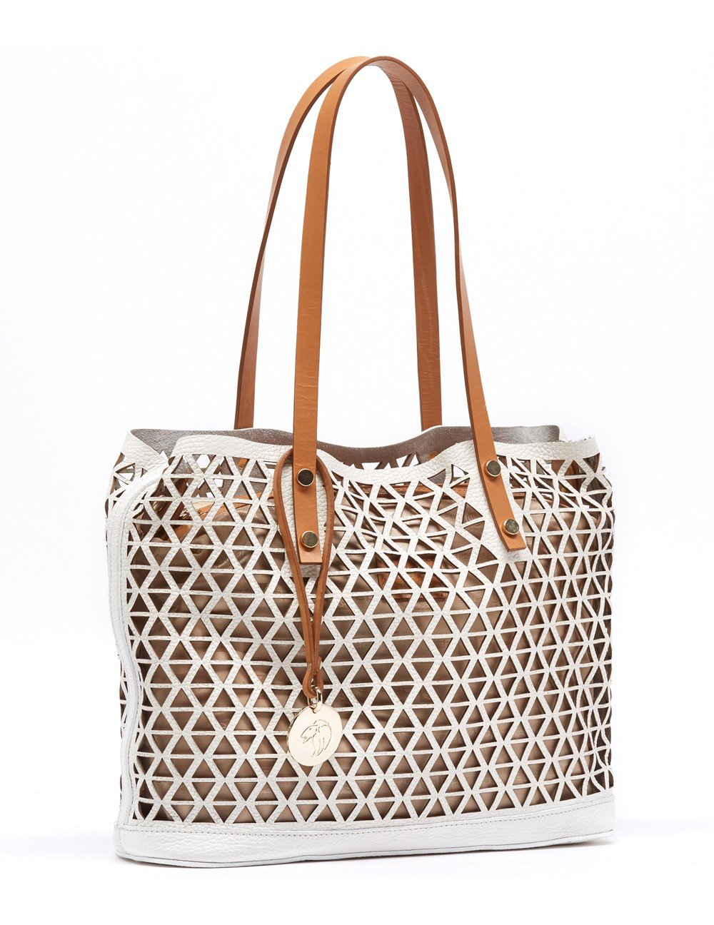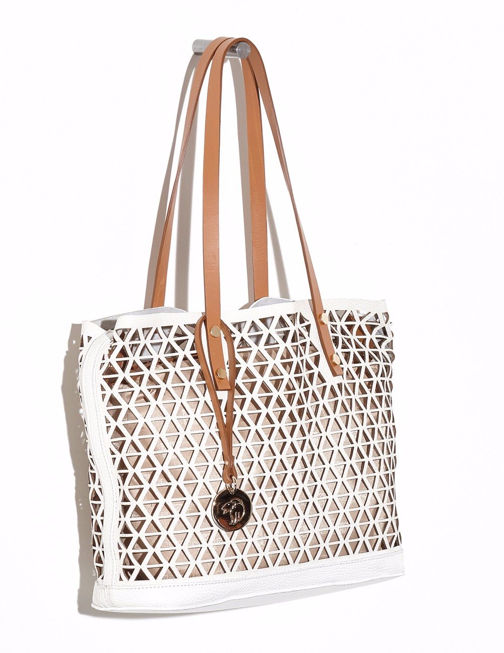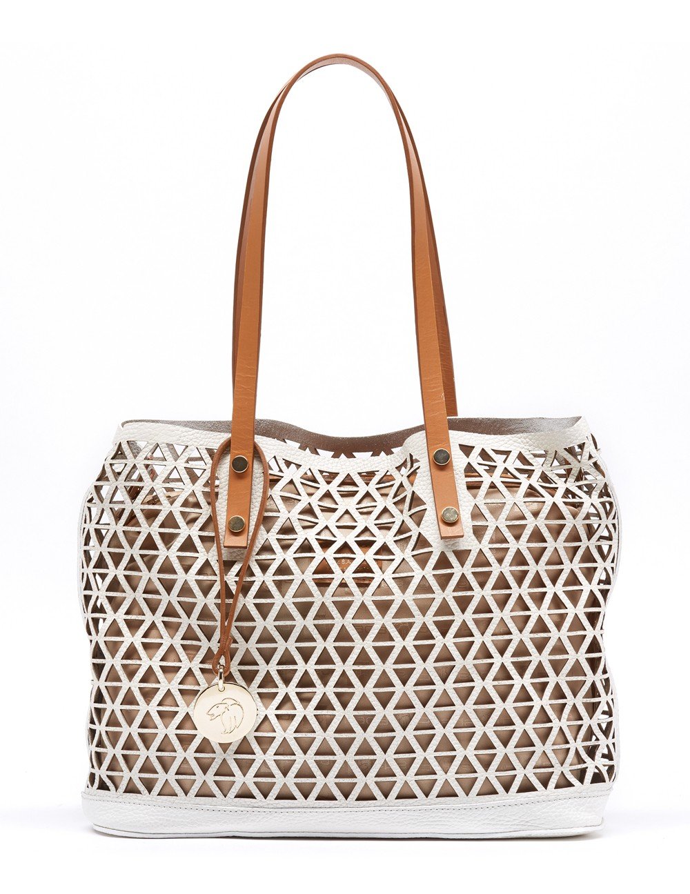 Bolso tote en acabado piel graneada. Detalle con corte láser en figuras geométricas, asas de piel en contraste. Bolsos utilitario interno extraíble y forro personalizado león Prada. Asa de hombro en contraste. Herrajes y fornituras en dorado, así como insignia león Prada. Medidas: 40x27x11 cm