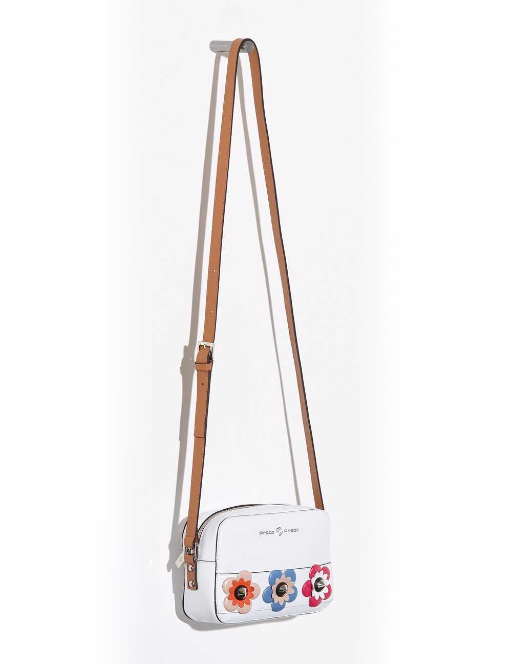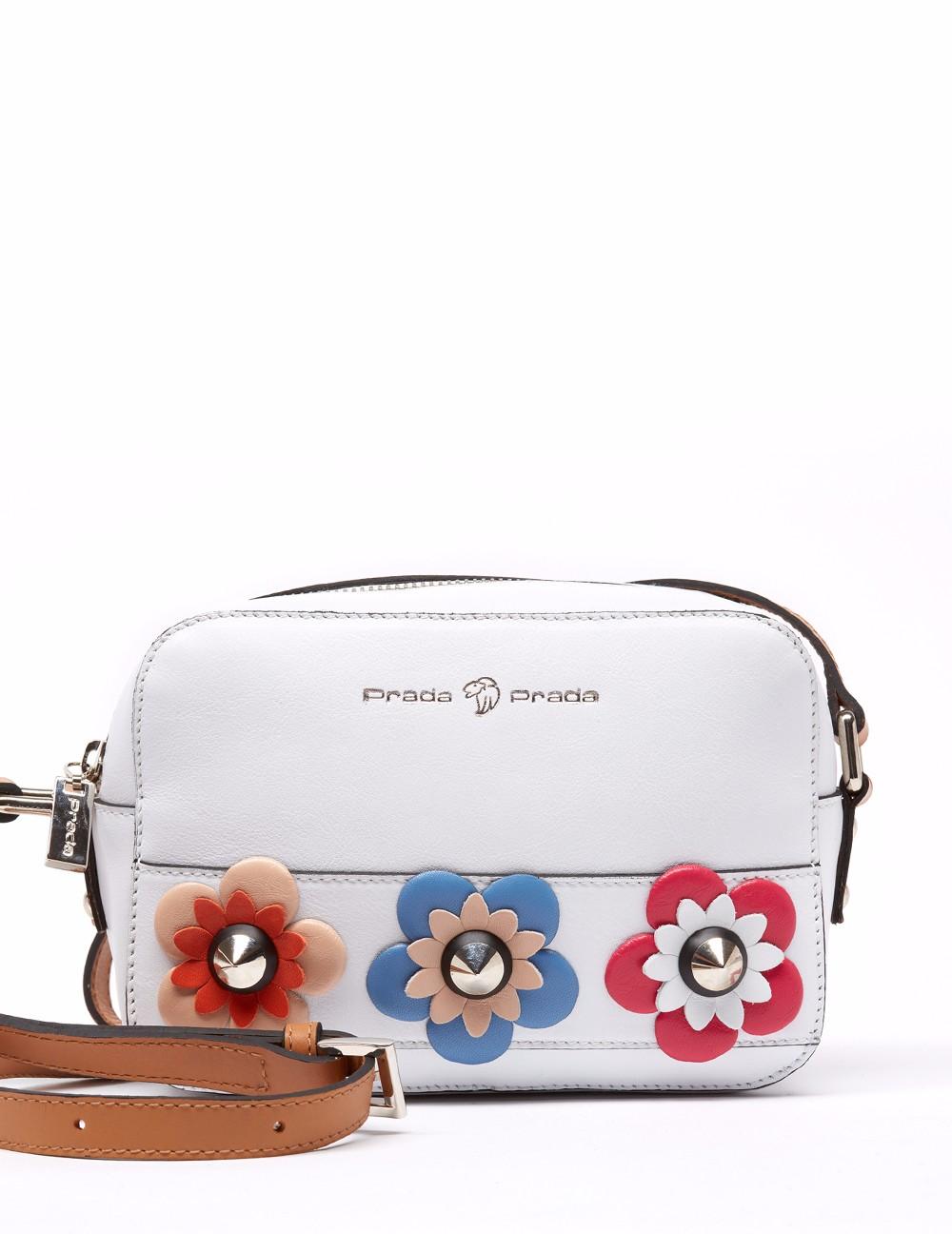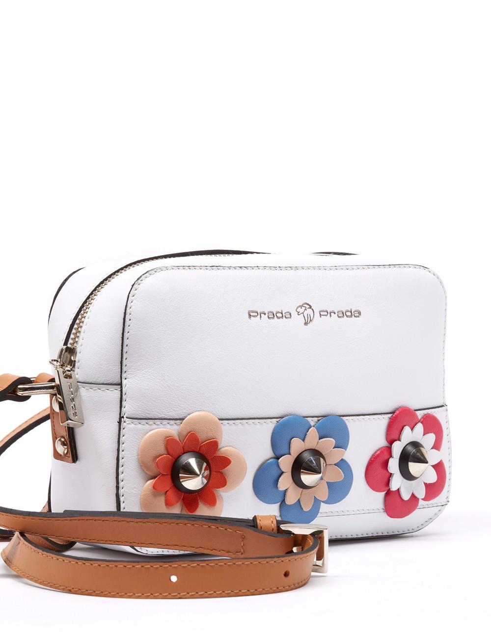 Bolso bandolera en acabado piel napa. Detalle de flores de colores y tachas en vista frontal, asa de piel en contraste. Bolsos utilitarios internos y forro personalizado león Prada, bolso utilitario con cremallera en la parte posterior. Asa bandolera con pespuntes al color. Herrajes y fornituras en plateado, así como grabado a fuego y timbrado en plateado. Medidas: 20x14x7 cm