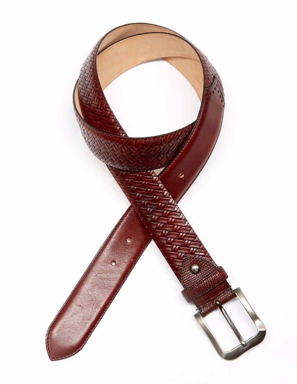 Cinturón en acabado napa grabada. Detalle de grabado tejido, puntera lisa con pala vega y pasantín en grabado tejus. Hebilla en acabado de plata tipo acero cepillado.