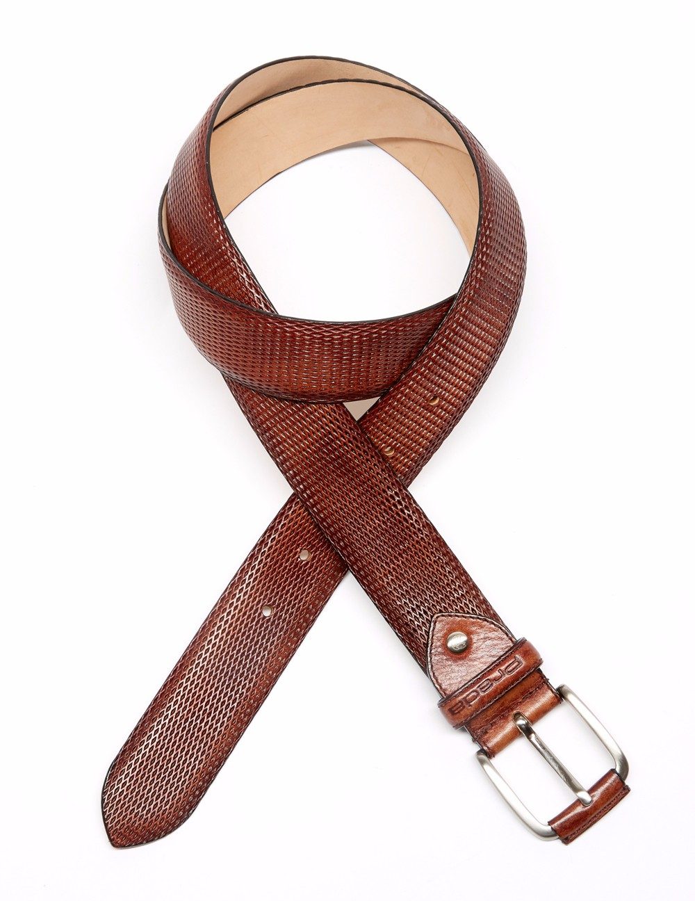 Cinturón en acabado grabado. Detalle de grabado canasta y pasantín en acabado napa vintage. Hebilla en plateado.