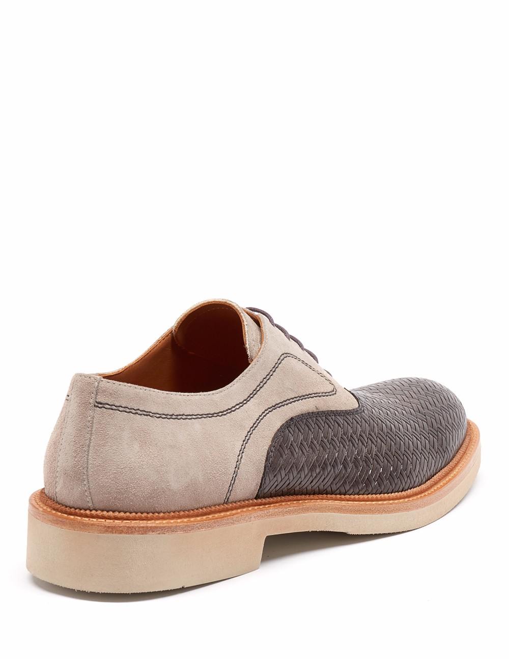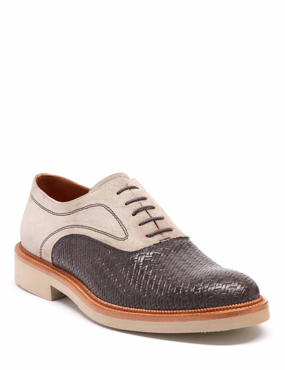 Inglés en acabado combinado ante y napa. Detalle de piel grabada tipo tejido en pala, pespuntes y cordones en contraste, cerco natural. Suela EVA en contraste.