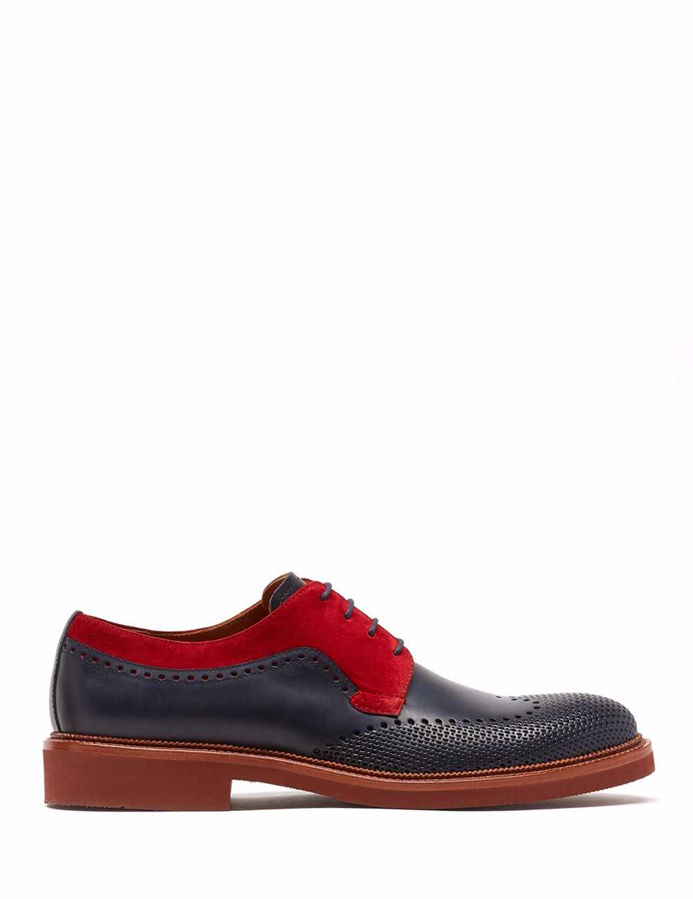 Blucher en acabado napa . Detalle de picado formando pala vega, cordones y collar en acabado ante en contraste, cerco natural. Suela Eva en contraste.