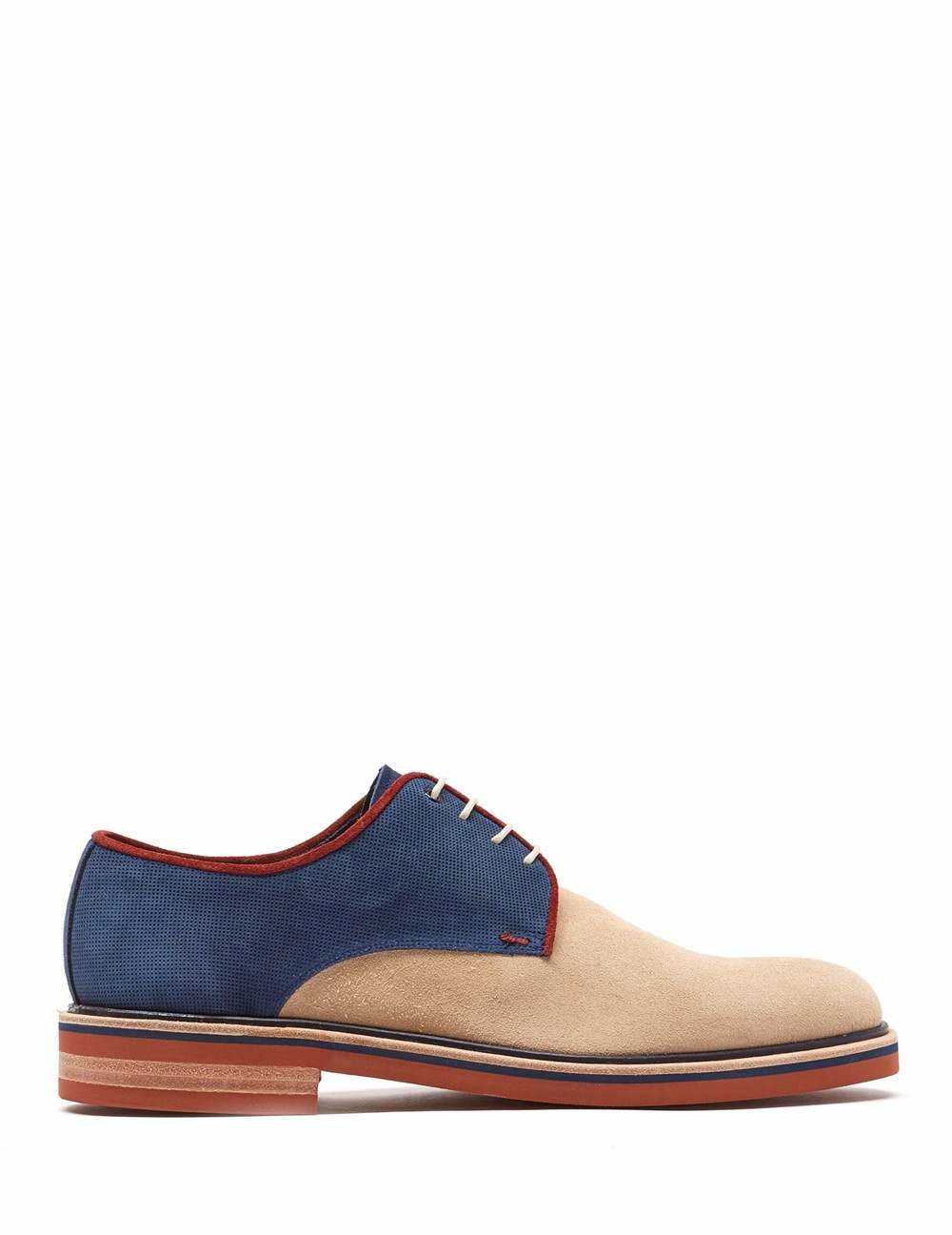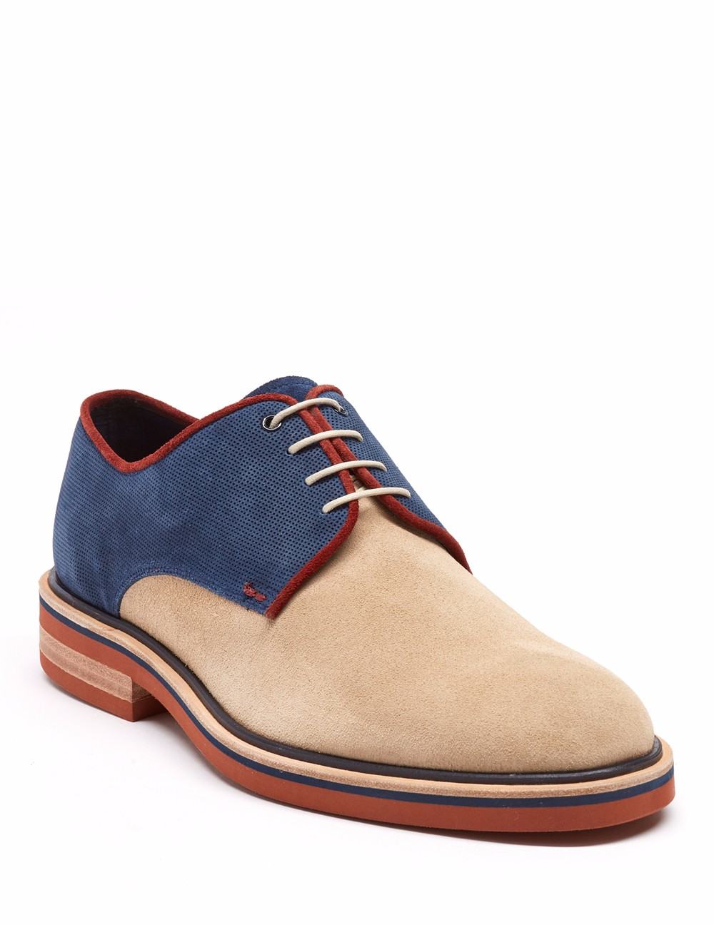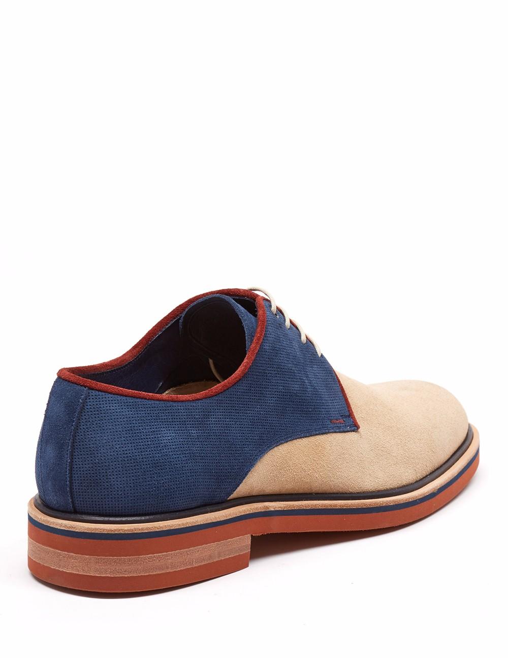 Blucher en acabado ante. Detalle de picado luigi en collar y contrafuerte con ribete en contraste., ojillo metálico y lengüeta en contraste, cerco natural. Suela de goma en contraste.