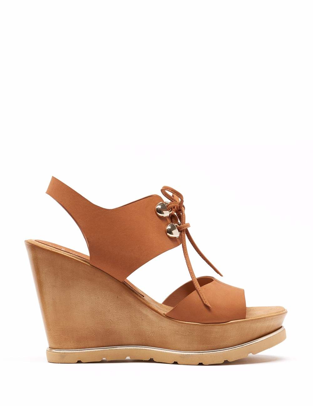 Sandalia en acabado nobuk. Detalle de lazadas cruzadas en tobillo que facilita el calce. Herrajes y fornituras en dorado. Tacón cuña de 9 cm con plataforma de 2.5 cm. En acabado natural