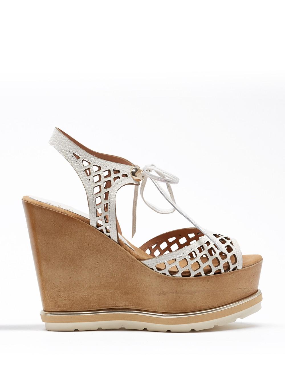 Peep toe destalonado en acabado piel graneada. Detalle de corte láser geométrico, con lazadas en pulsera cruzada en tobillo. Plataforma cuña 10 cm forrada en corcho con ribetes en contrate y suela flatform.