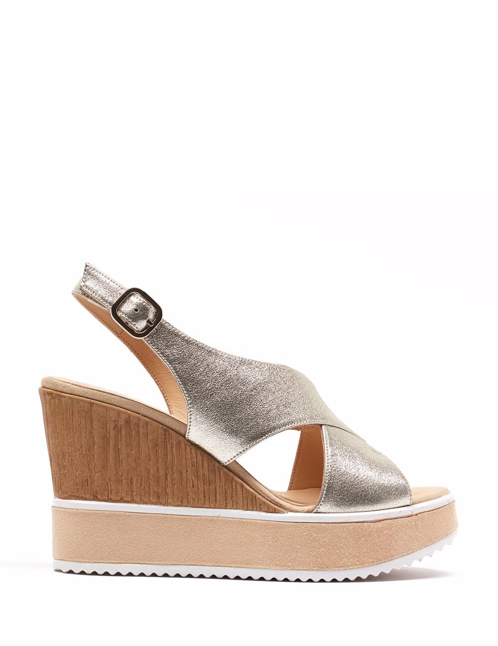 Sandalia en acabado piel metálica. Detalle de pala en corte "X" que facilita el calce de casi cualquier tipo de pie, pulsera en talón que facilita el calce. Herrajes en plateado. Cuña de 10 cm en acabado natural y plataforma de 3.5 cm forrada en ante con ribete en contraste blanco