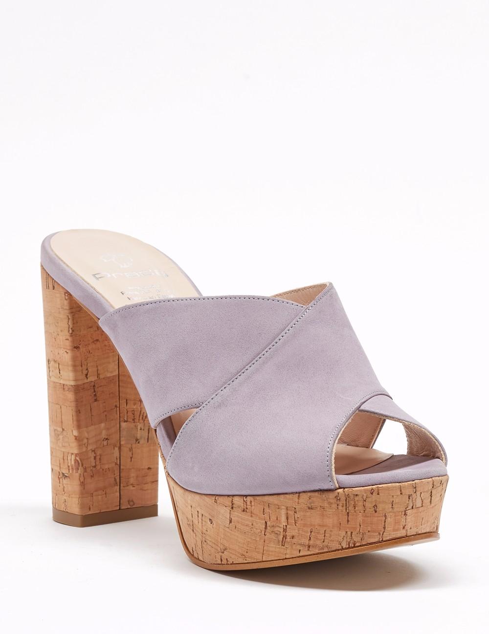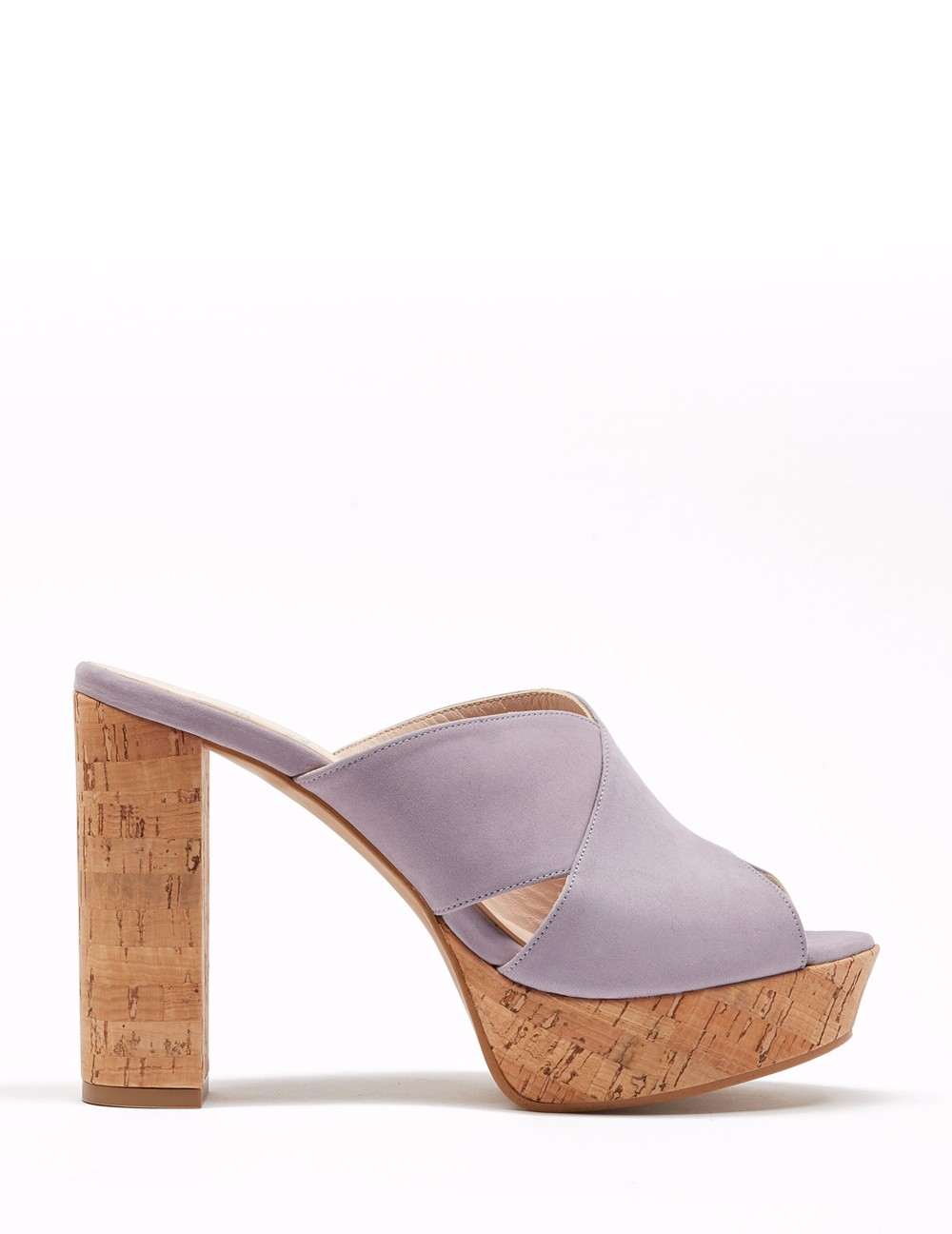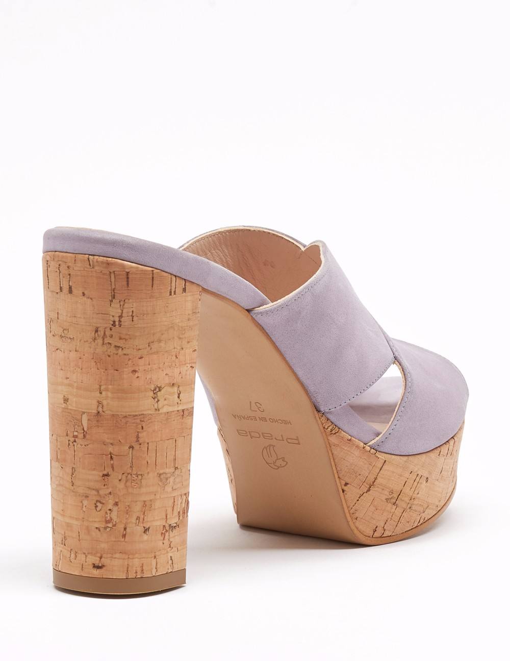 Mule en acabado ante. Detalle de pala corte "X", que facilita el calce. Plataforma de 3 cm y tacón forrado de 10.5 cm en acabado corcho.