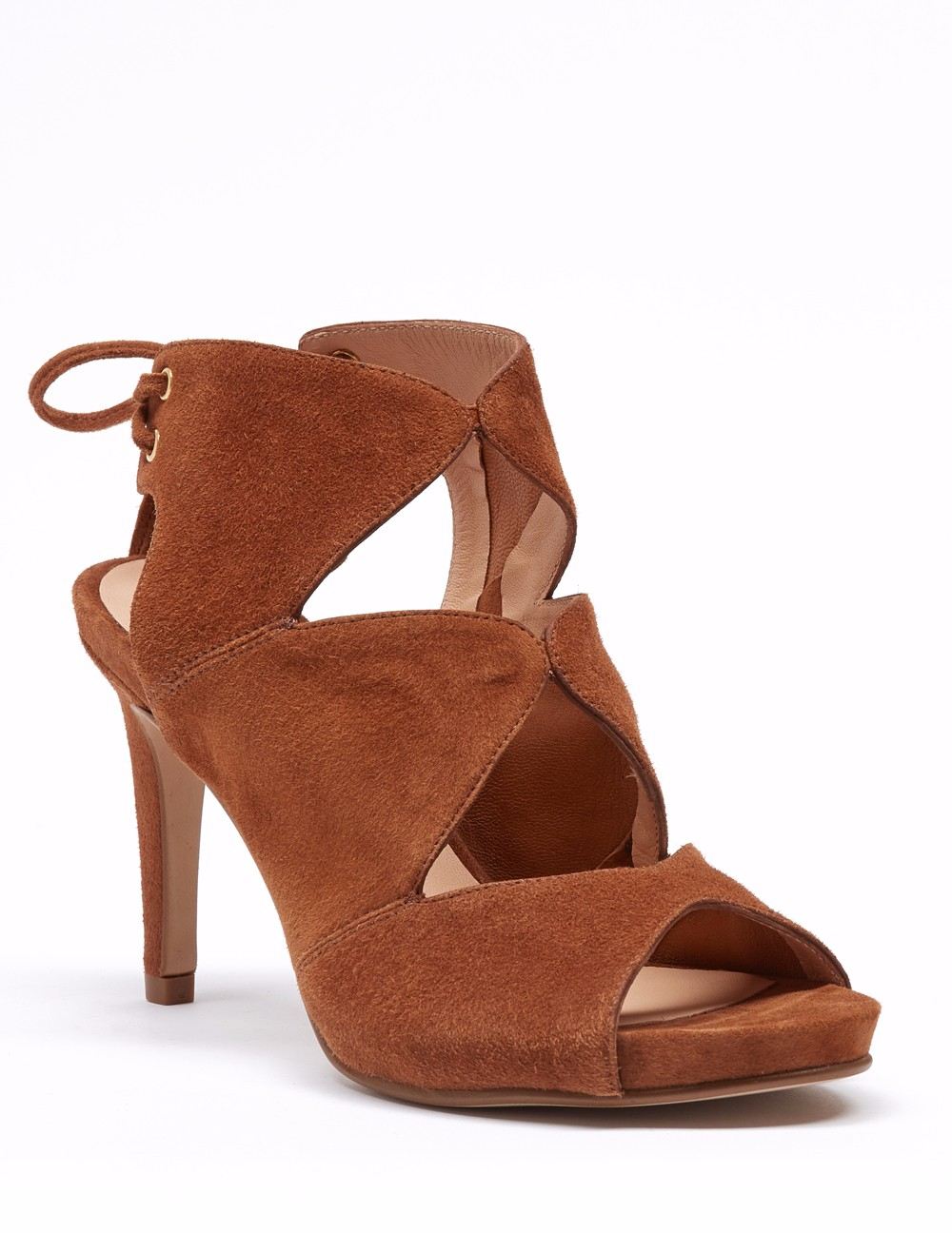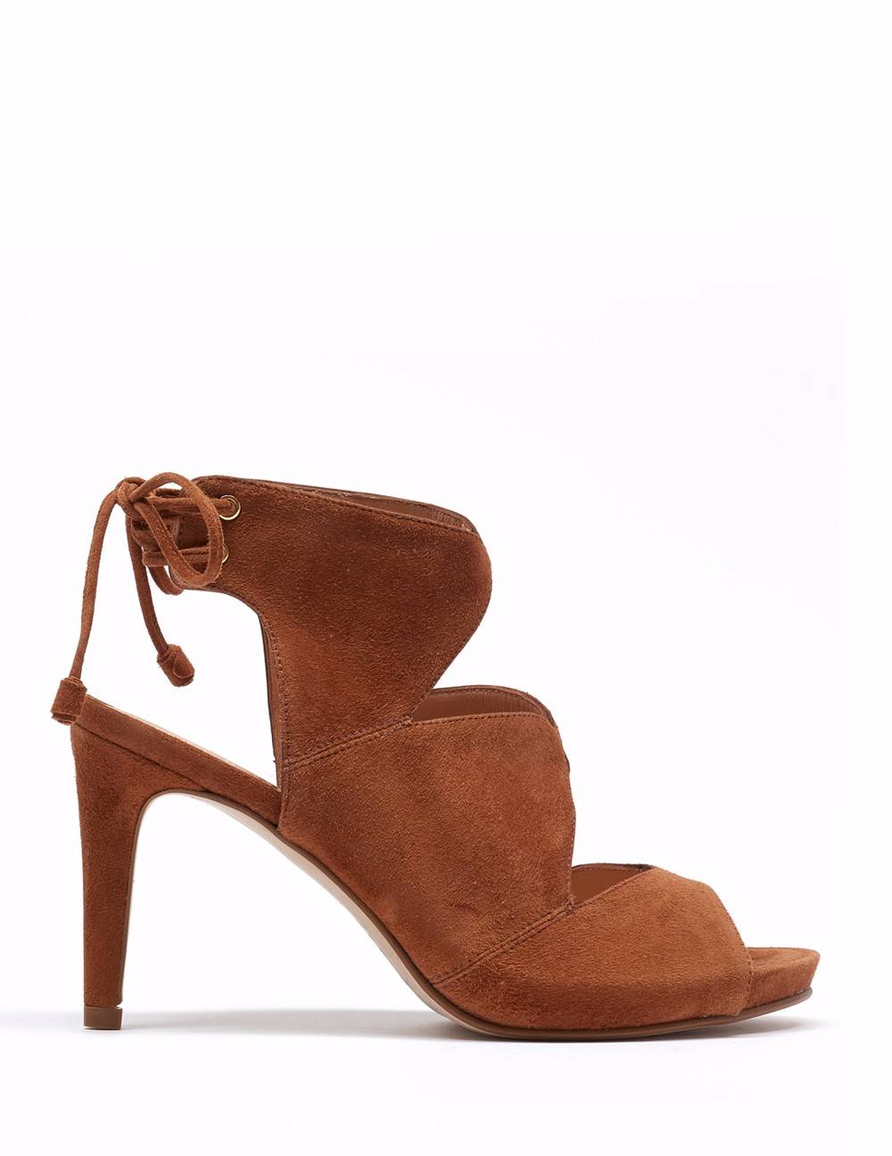 Sandalia abotinada en acabado ante. Detalle de cortes en rombo en pala, lazadas en talón que facilitan el calce. Tacón stiletto de 8 cm y forrado.