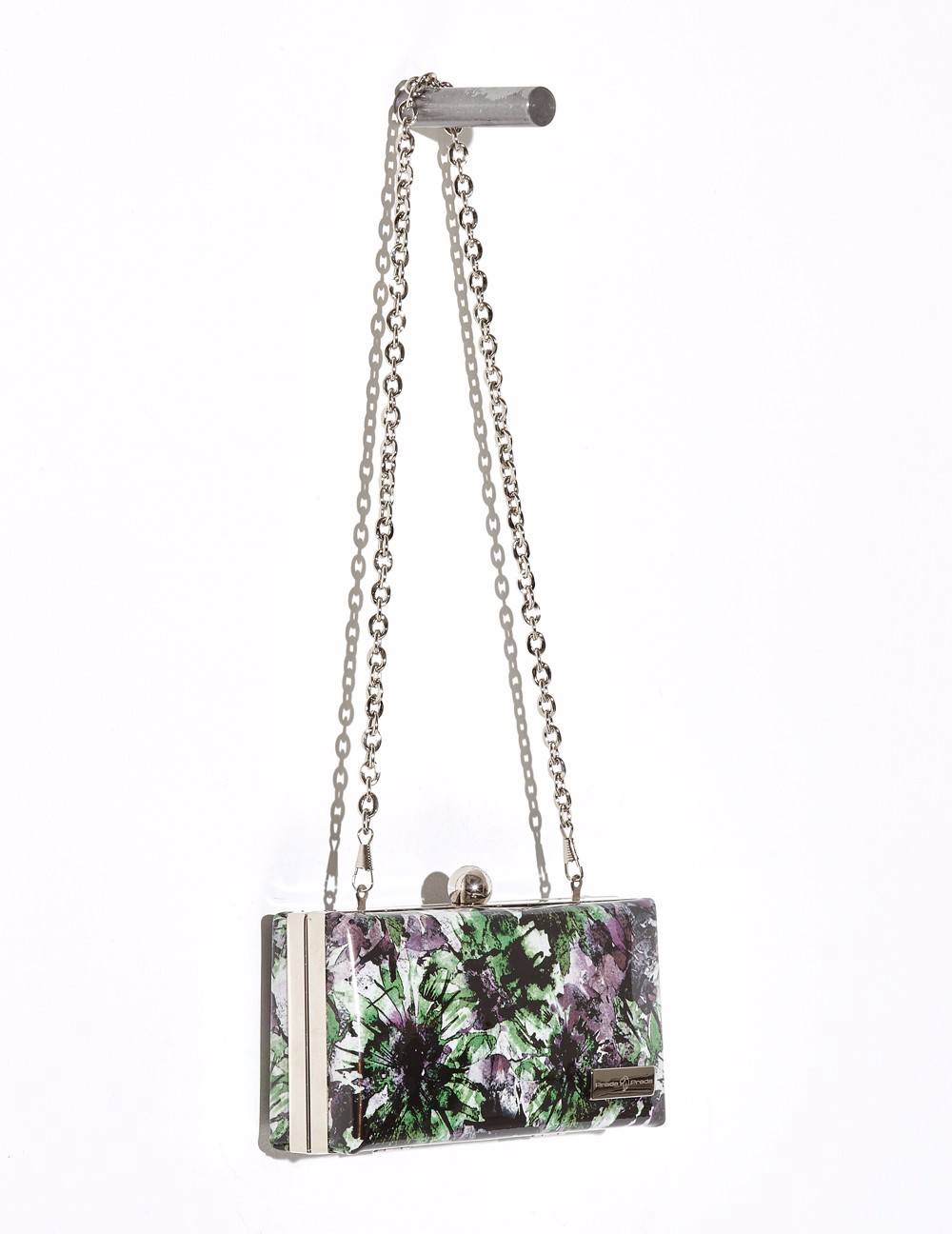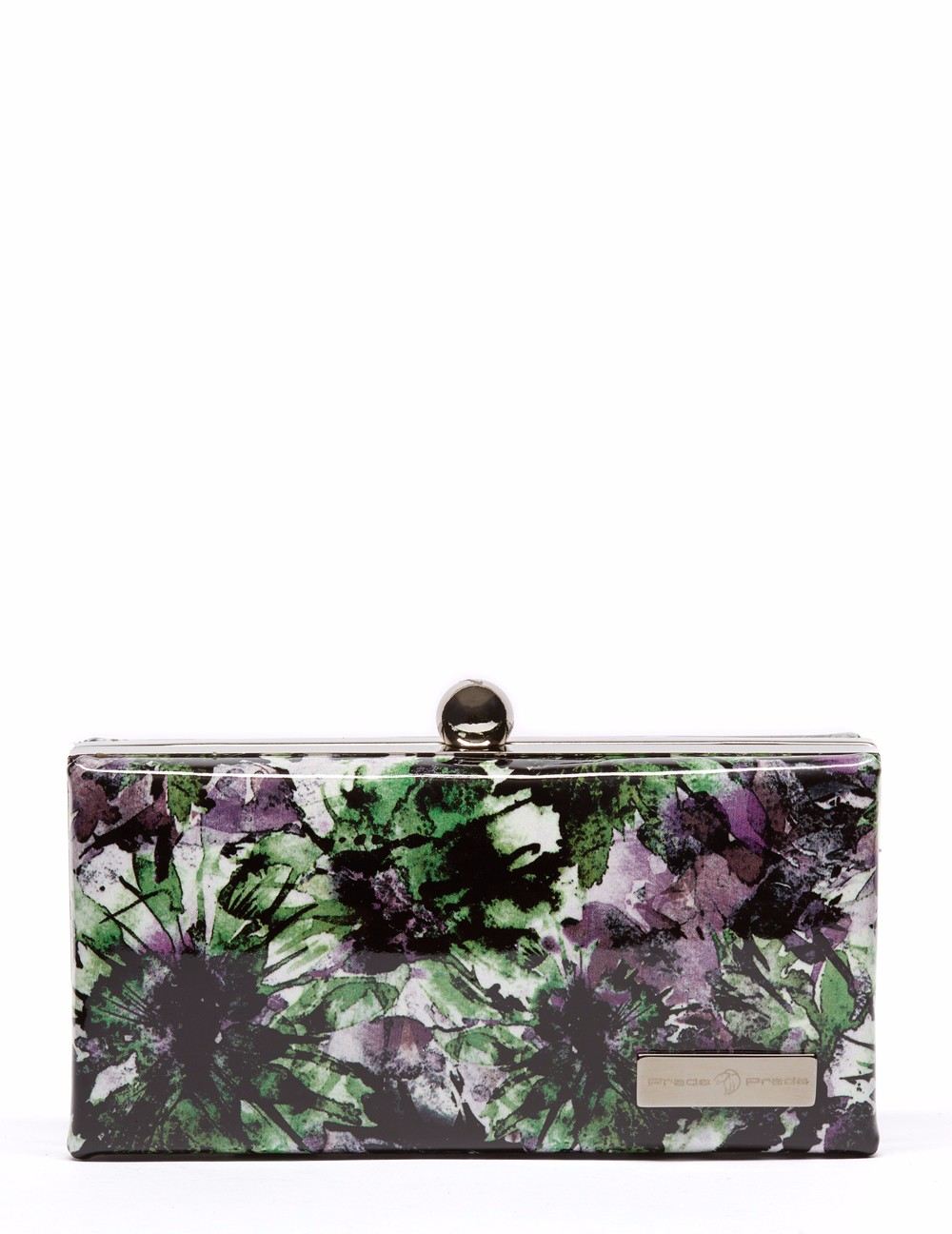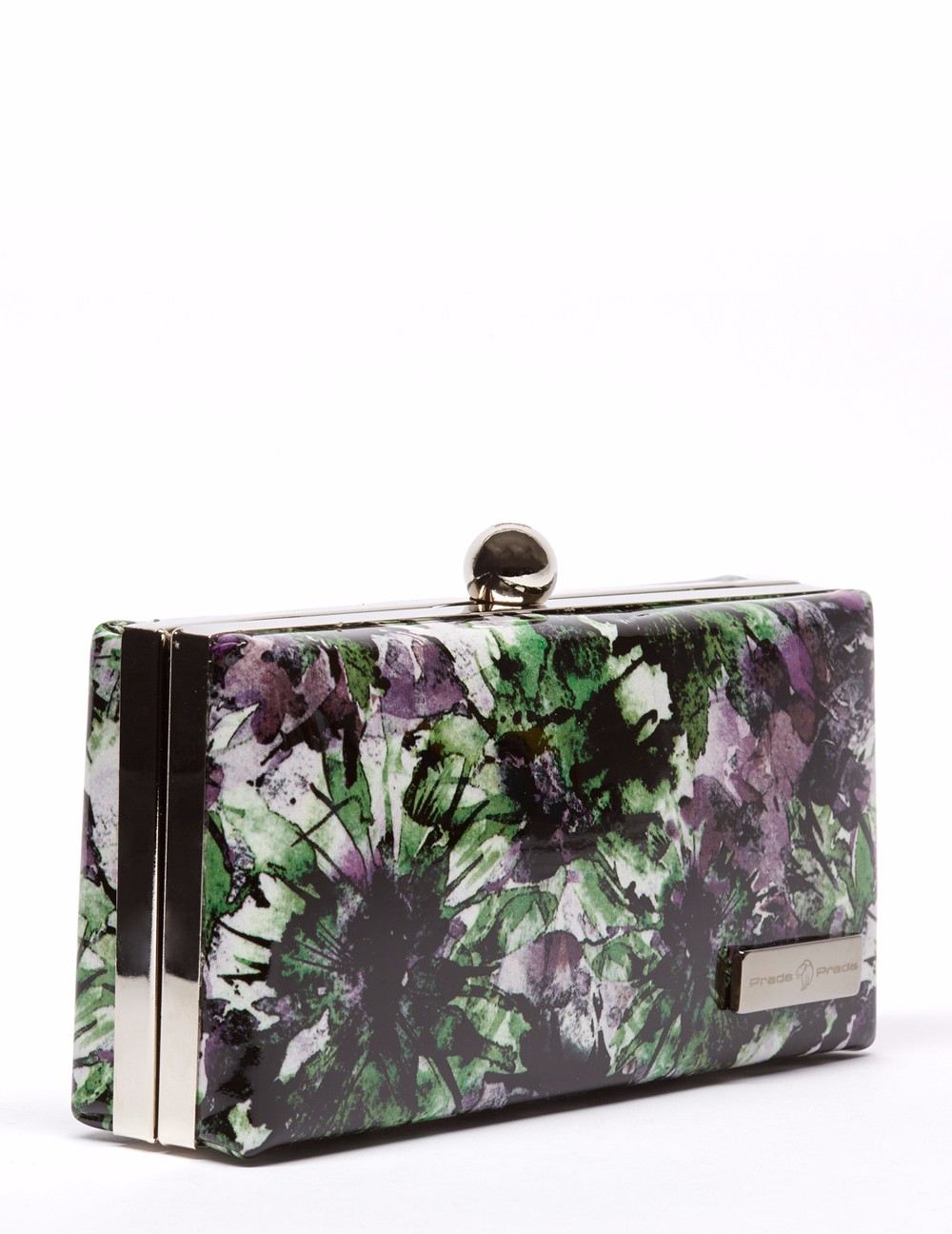 Bolso clutch en acabado charol. Detalle de vistas vistas principales en charol con vista de acuarela floral, broche de presión en metal. Forro personalizado león Prada. Herrajes y fornituras en níquel negro. Medidas: 18x8.5x4.5 cm