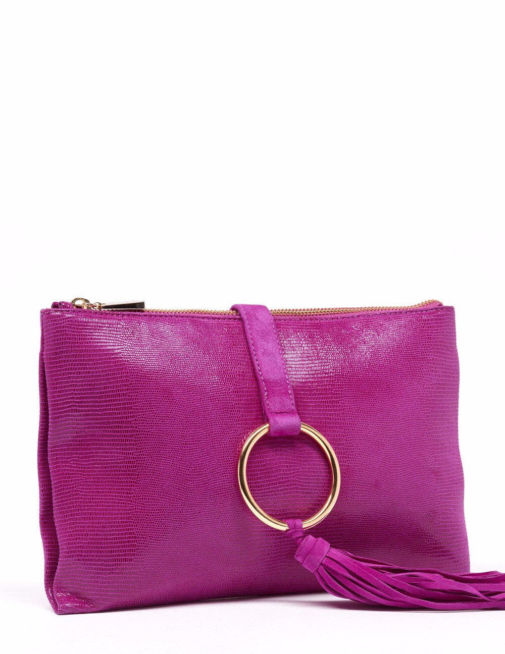 Bolso clutch en acabado ante. Detalle de grabado tejus en vistas principales con solapa delgada y adorno circular con pompón en ante al tono. Bolsos utilitarios internos y forro personalizado león Prada. Herrajes y fornituras en dorado, así como placa león Prada. Medidas: 27.5x19x2 cm