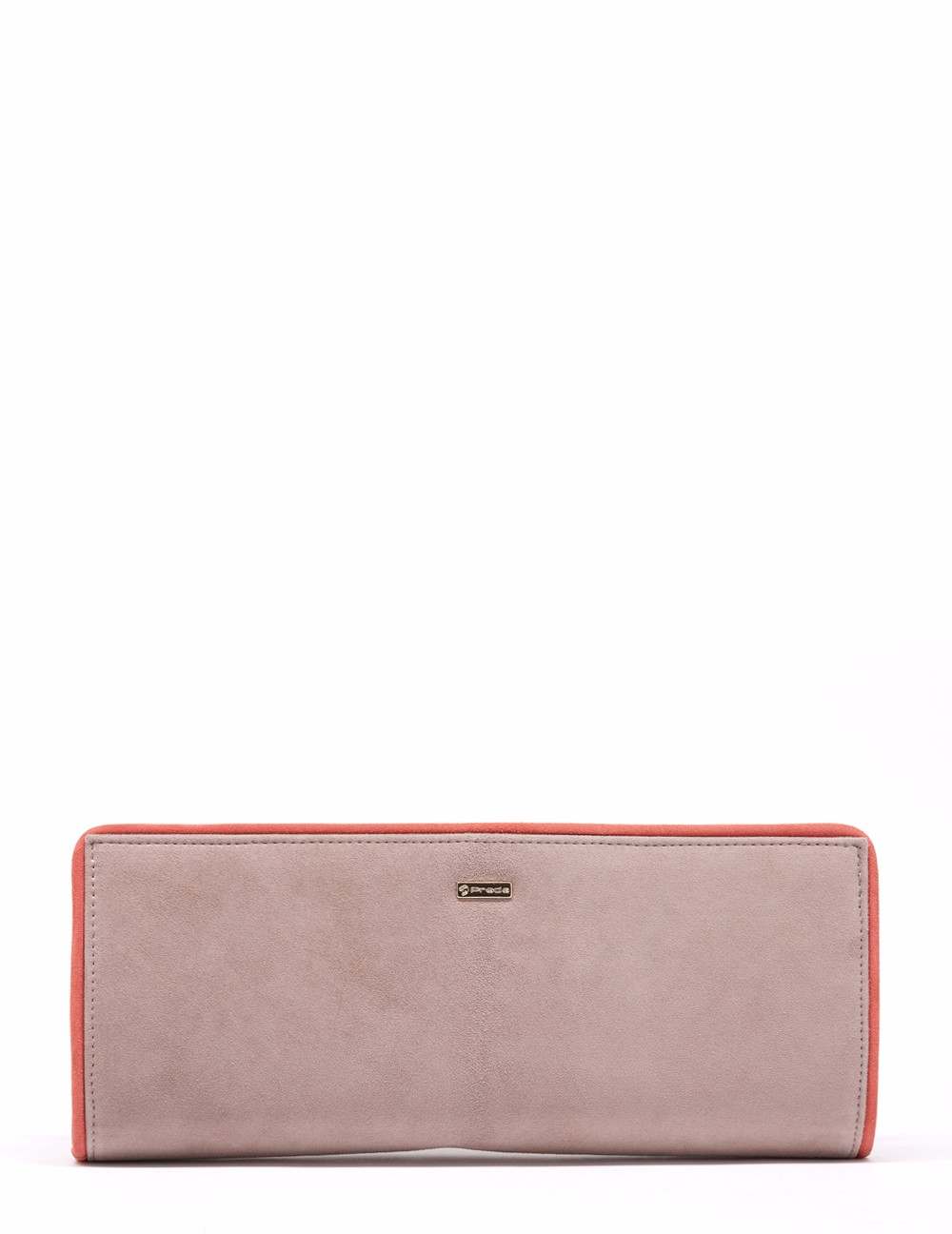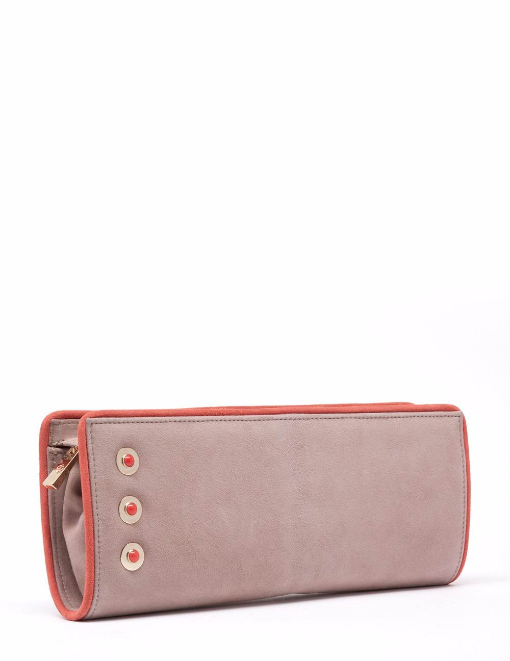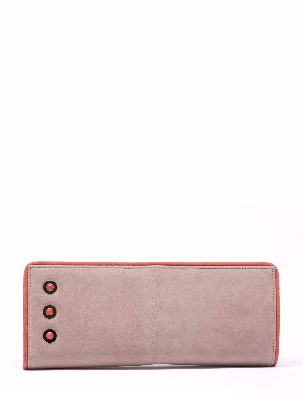 Bolso clutch en acabado ante. Detalle de ante con ribete en contraste y adornos metálicos en frontal. Herrajes y fornituras en dorado, así como placa león Prada. Medidas: 29x12x5 cm