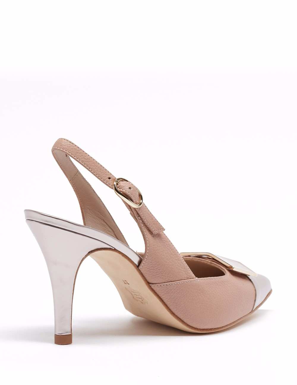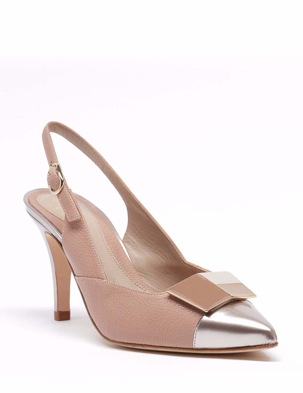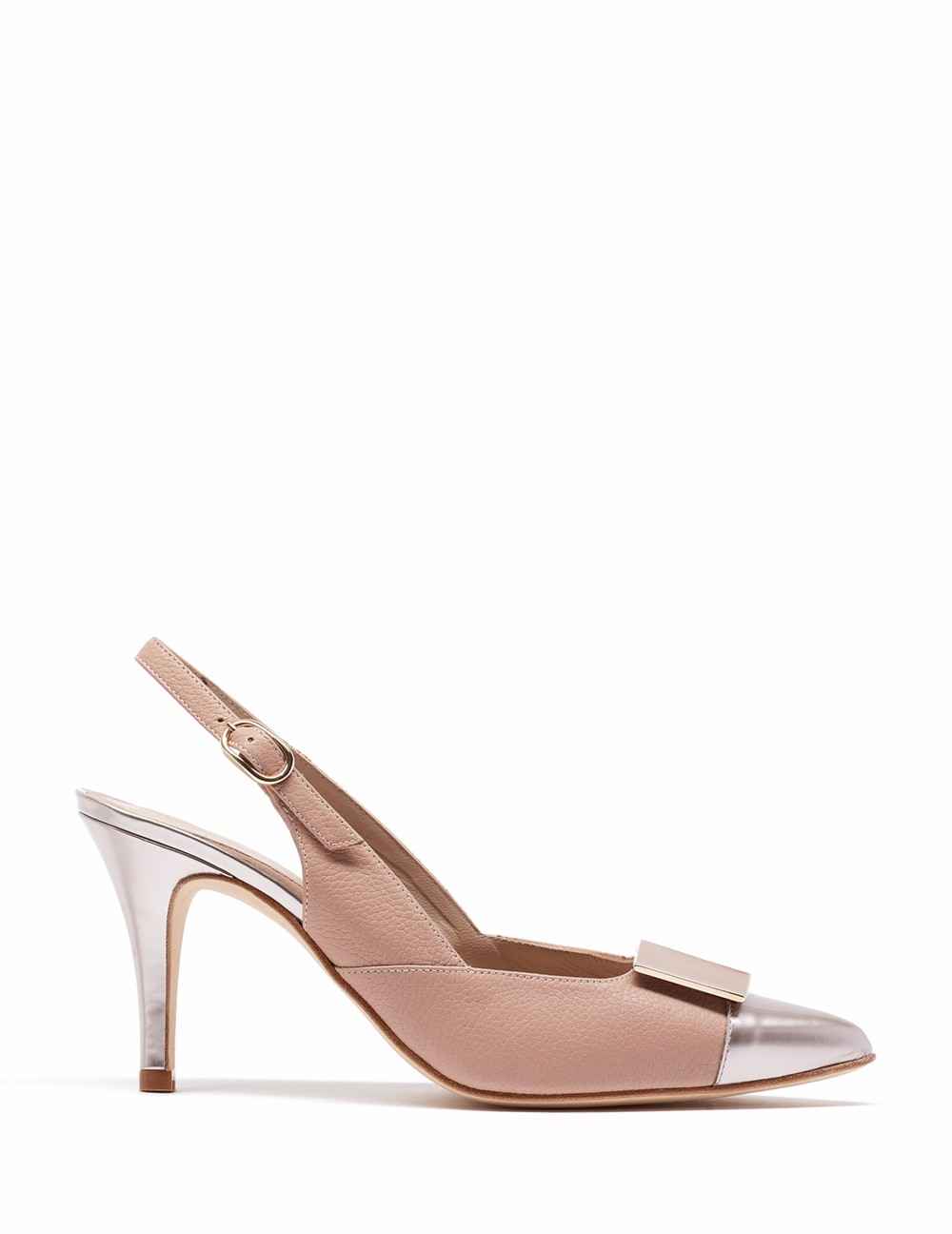 Destalonado en acabado piel graneada. Detalle de puntera en florantique y adorno metálico en pala, pulsera en talón. Herrajes y fornituras en dorado. Tacón forrado de 7.5 cm.