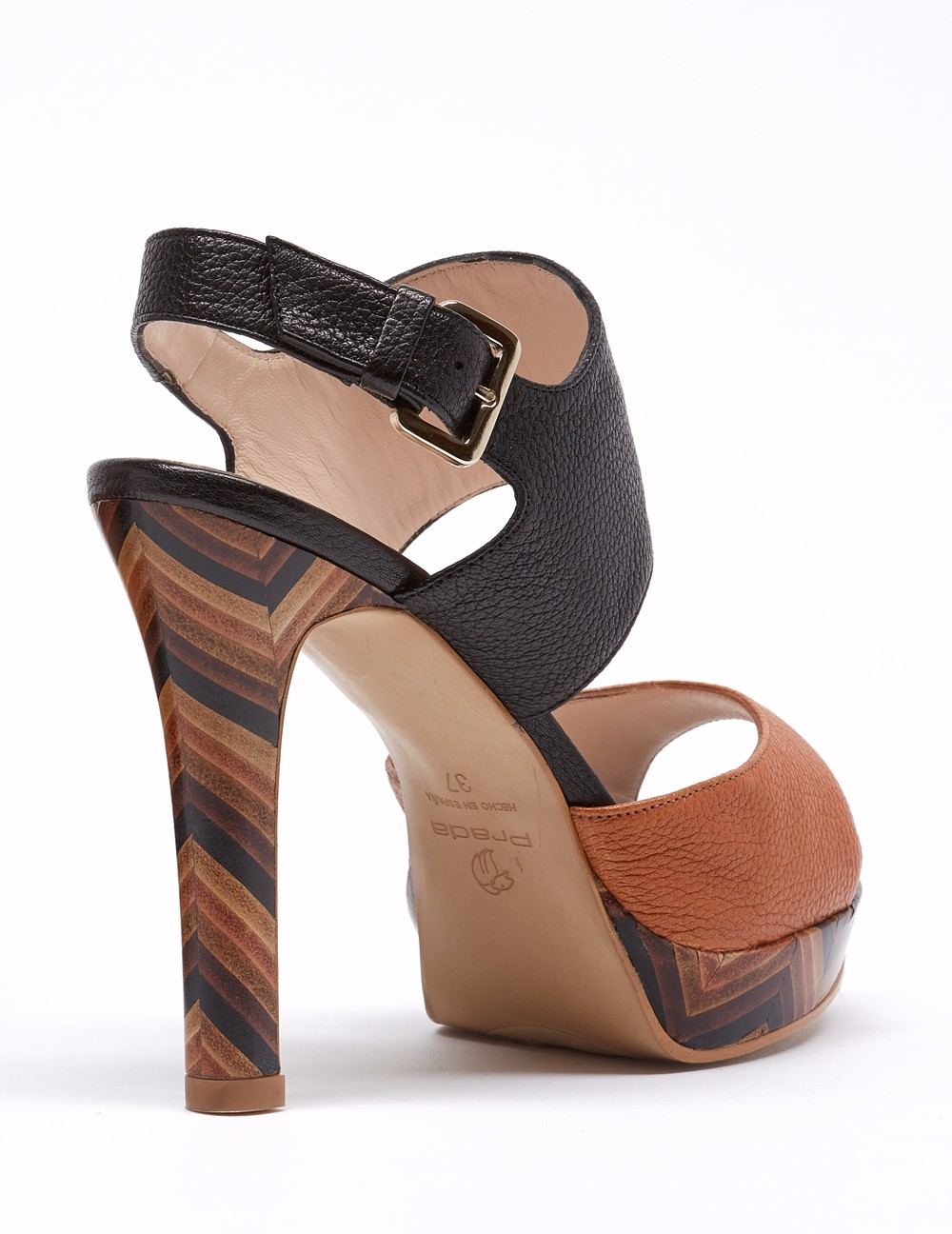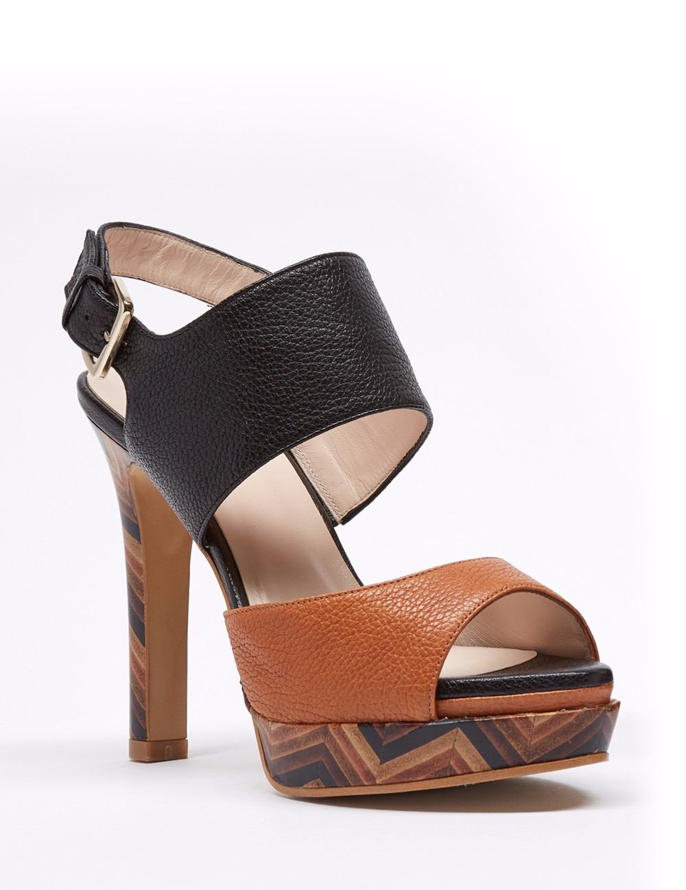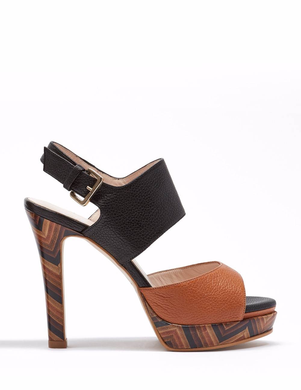Sandalia en acabado piel graneada. Detalle de maxipulsera en pala alta que facilita el calce. Herrajes y fornituras en plateado. Tacón de 11 cm y plataforma de 3, forrada en acabado tipo parquet.