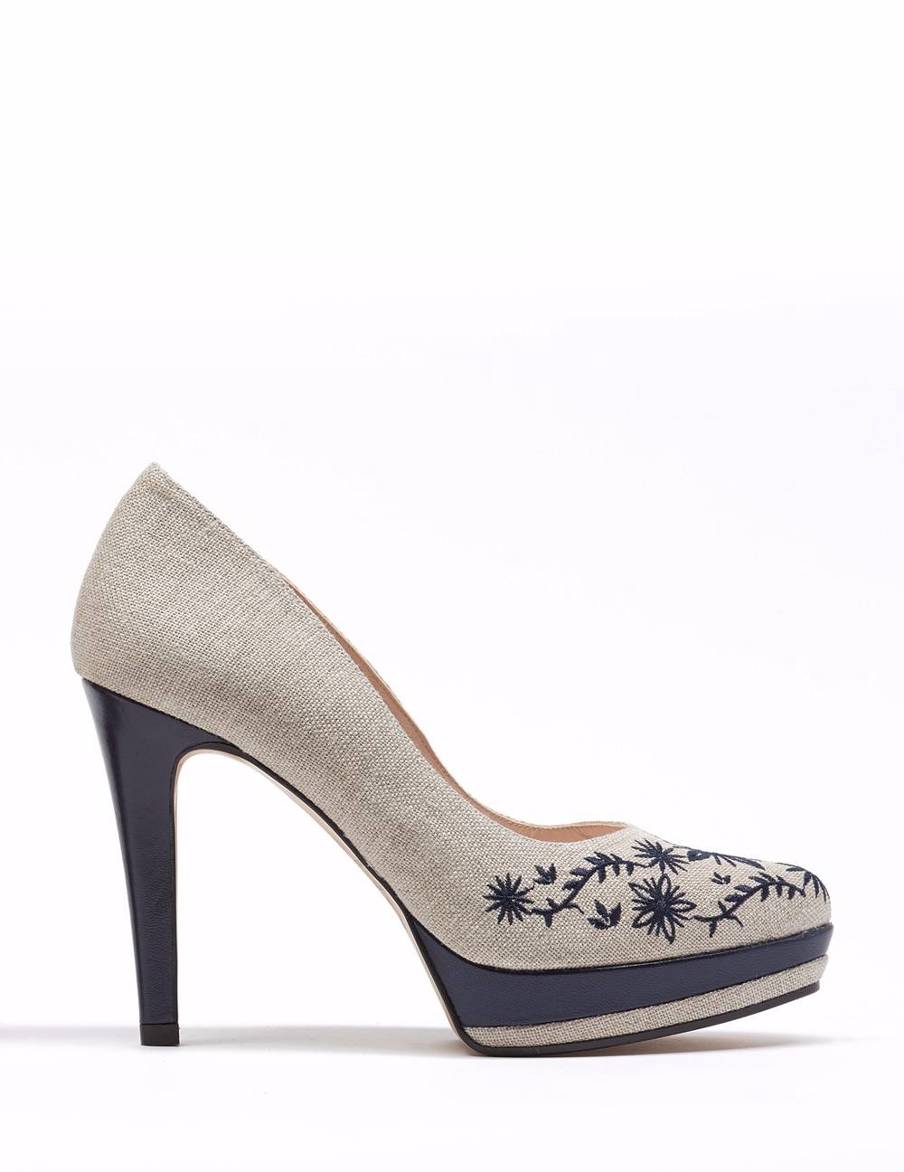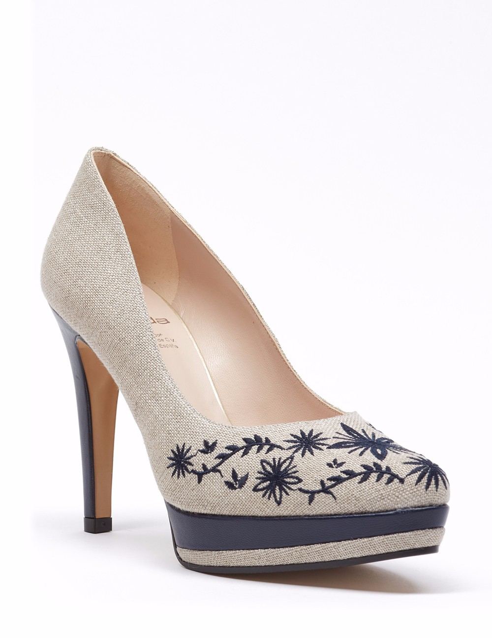 Stiletto en acabado textil. Detalle de flores bordadas en pala en tonos azul marino. Tacón stiletto de 10 cm y plataforma de 3 cm forrada.
