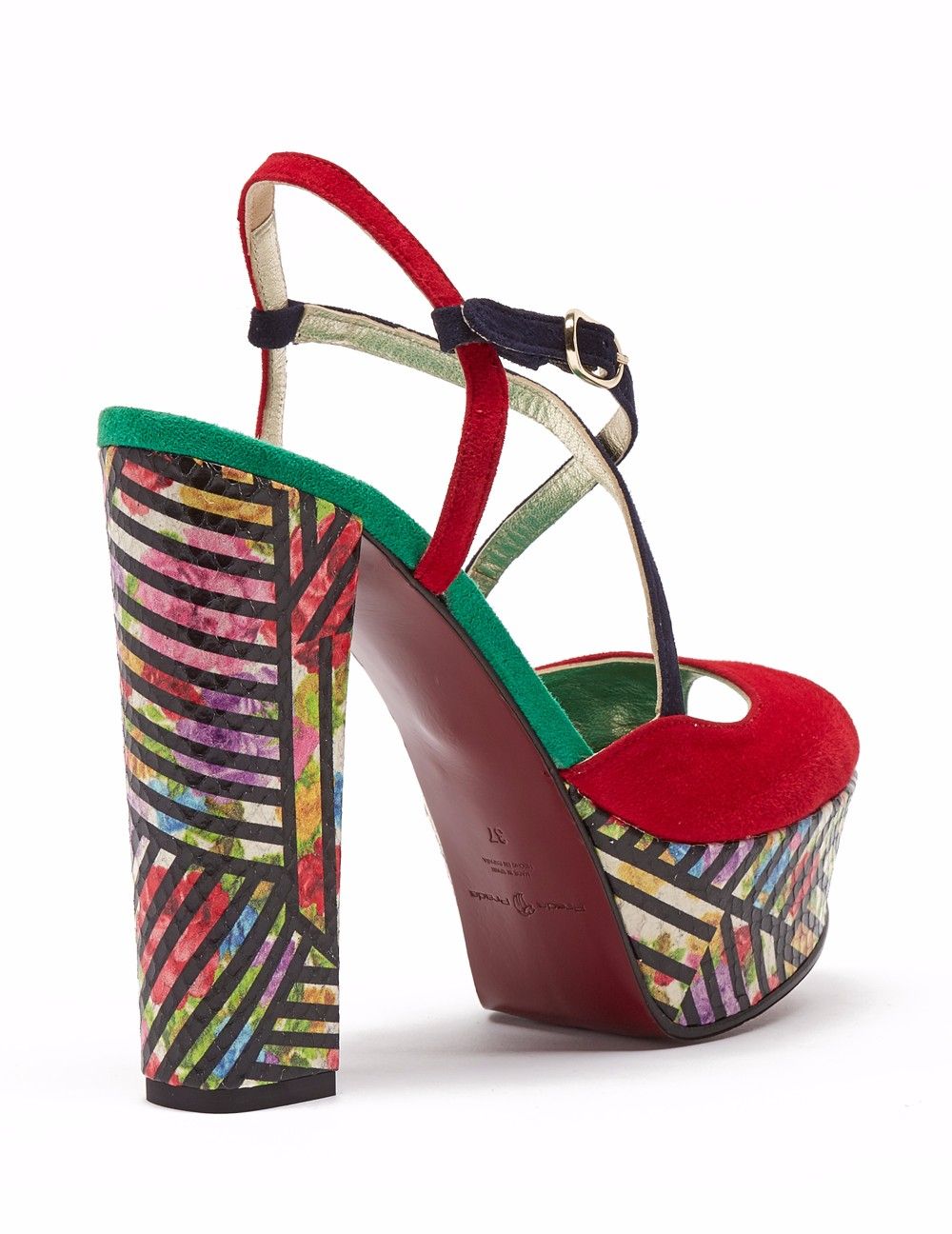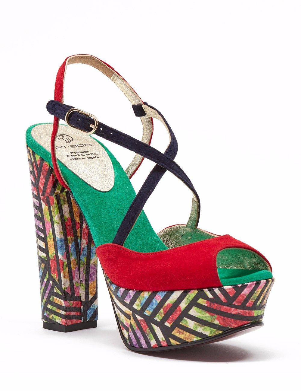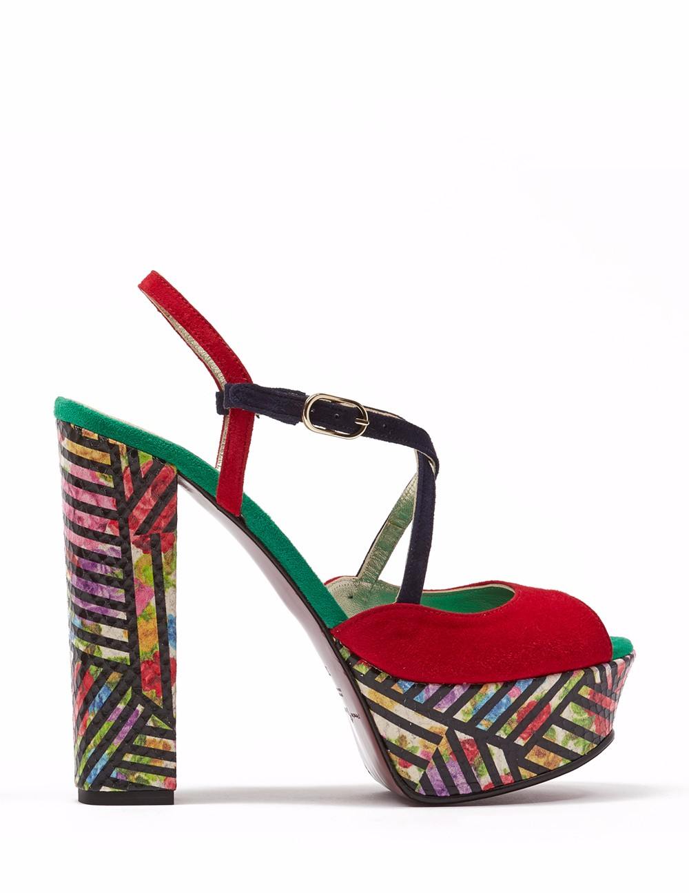 Sandalia en acabado ante, Detalle de pala con tiras cruzadas en "X", y pulsera al tobillo que facilita el calce. Tacón cuadrado de 12.5 cm y plataforma de 4 cm en acabado grabado serpiente lineal en contraste.