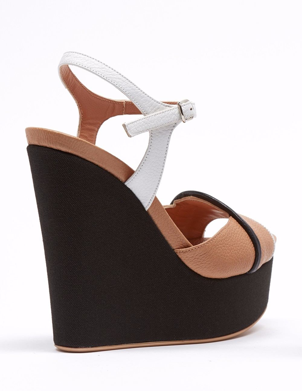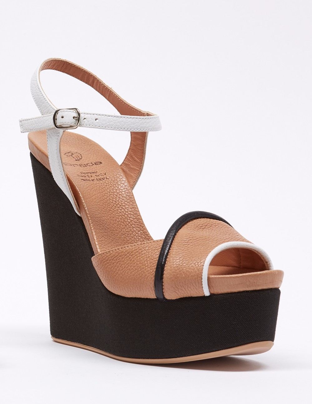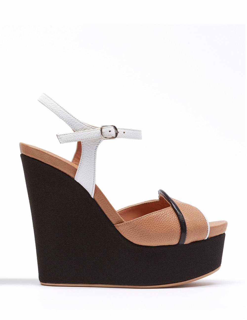 Sandalia en acabado graneado. Detalle de pala con ribetes en dos colores en contraste, pulsera al tobillo que facilita el calce. Plataforma de 13 cm y cuña forrada en textil.
