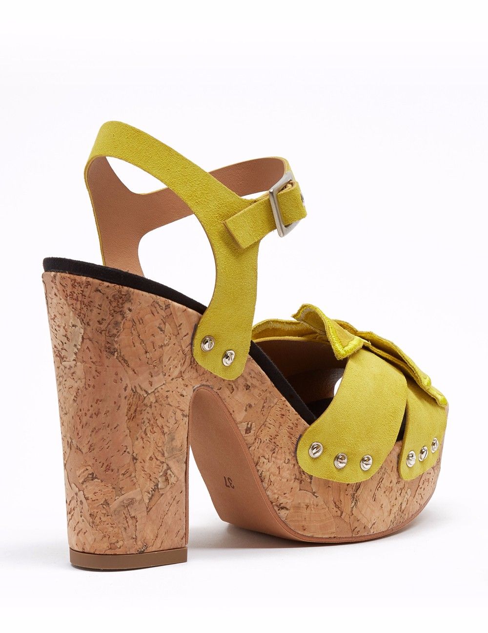 Sandalia en acabado ante. Detalle de maxiflor decorativa en pala, pulsera en talón y detalle de tachas laterales de plataforma. Plataforma de 11 cm y tacón de 4 cm, en acabado de corcho que le da una apariencia rústica.