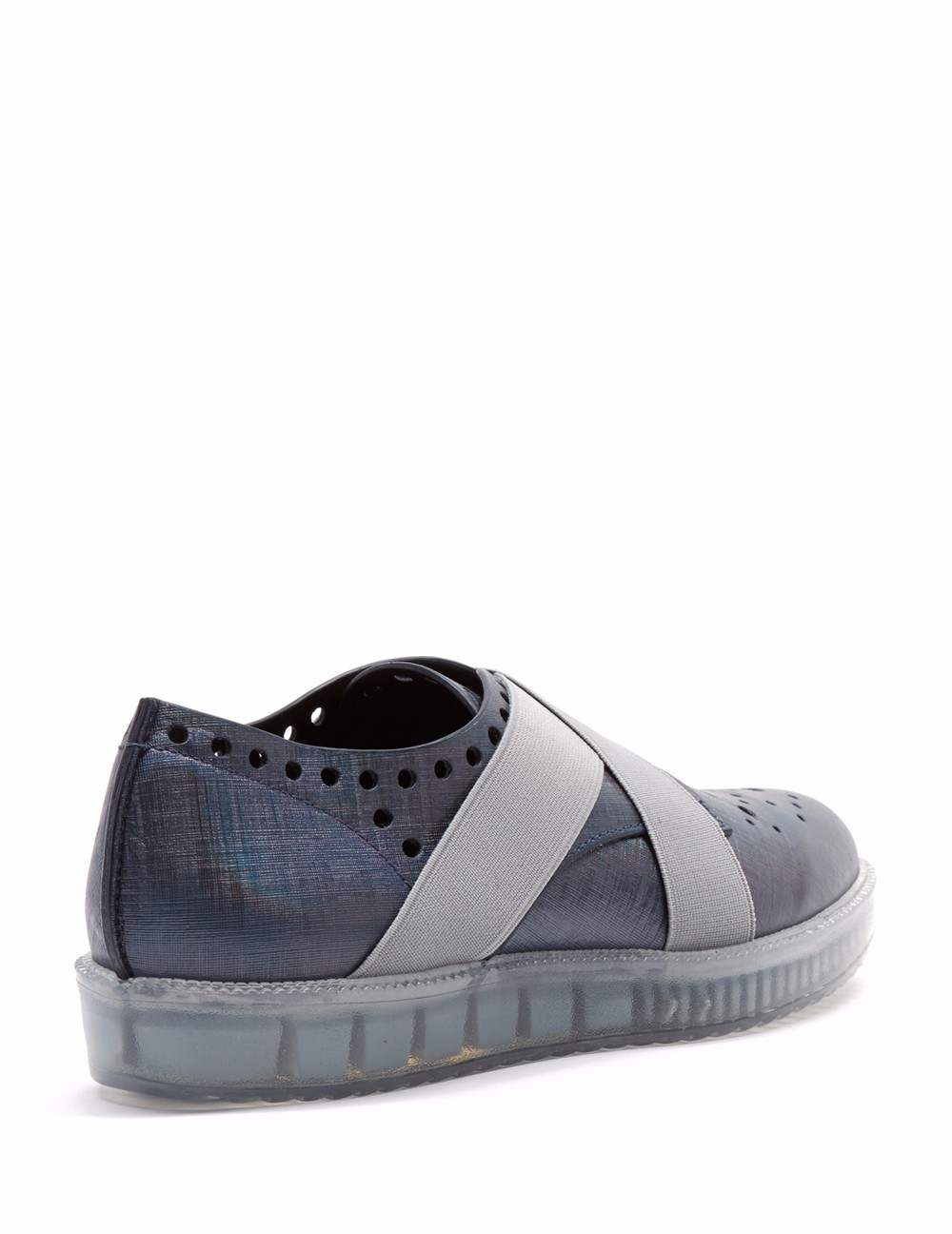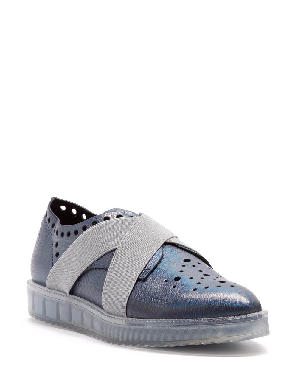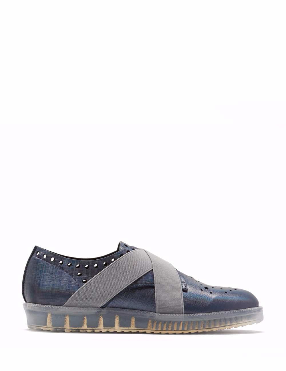 Deportivo en acabado saffiano metálico. Detalle de picados en pala y cañas, elásticos cruzados en pala. Suela cristal.