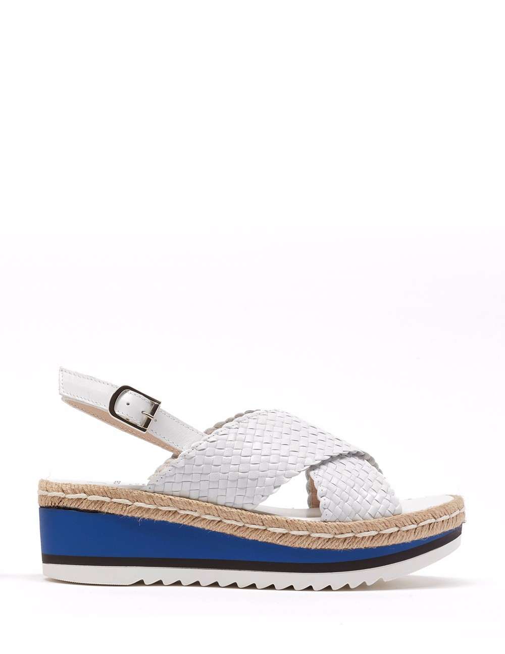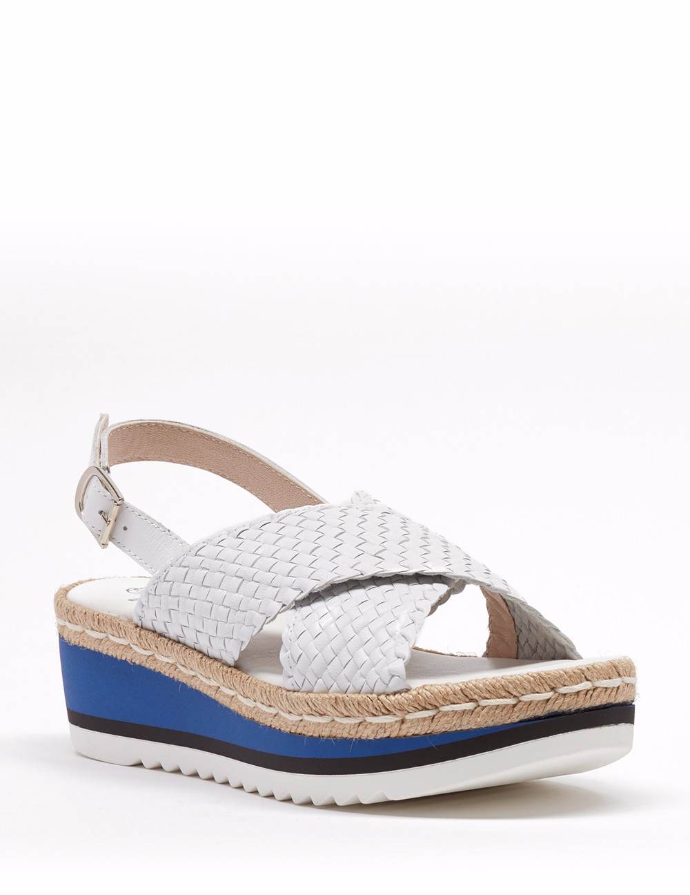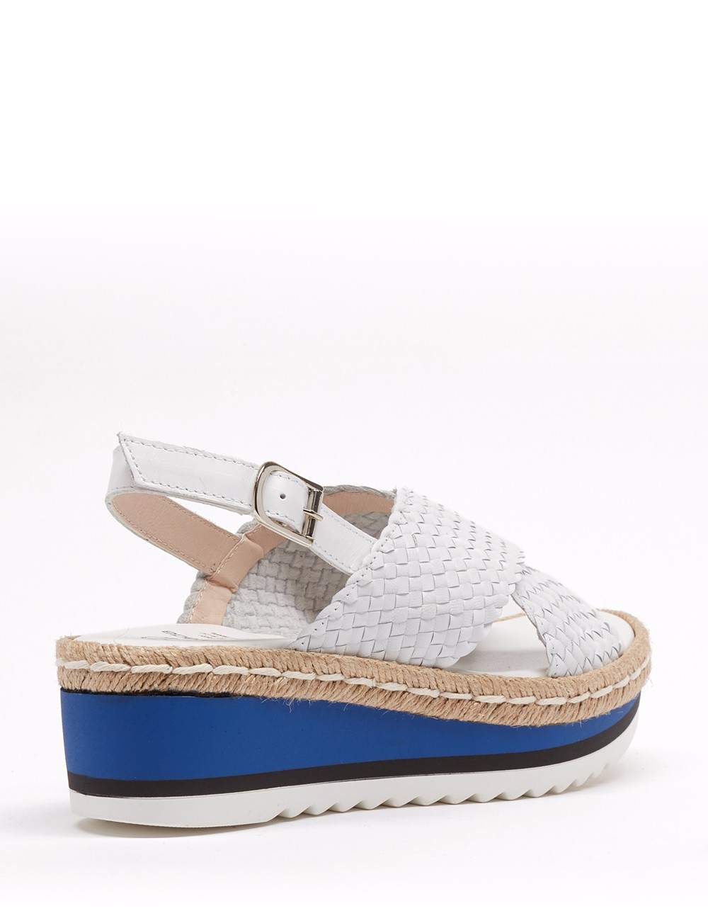 Sandalia en acabado napa tejida. Detalle de piel tejida y pulsera en tobillo. Herrajes en plata. Plataforma de 5cm en flatform con cerco de trenza en yute con pespunte en contraste.