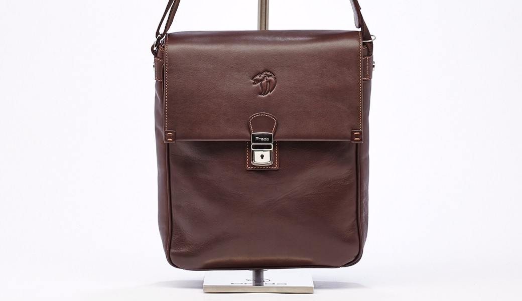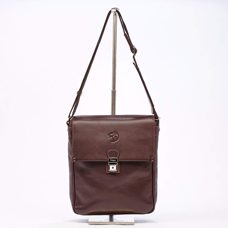 Bandolera mediana en acabado napa. Detalles león Prada" grabado a fuego